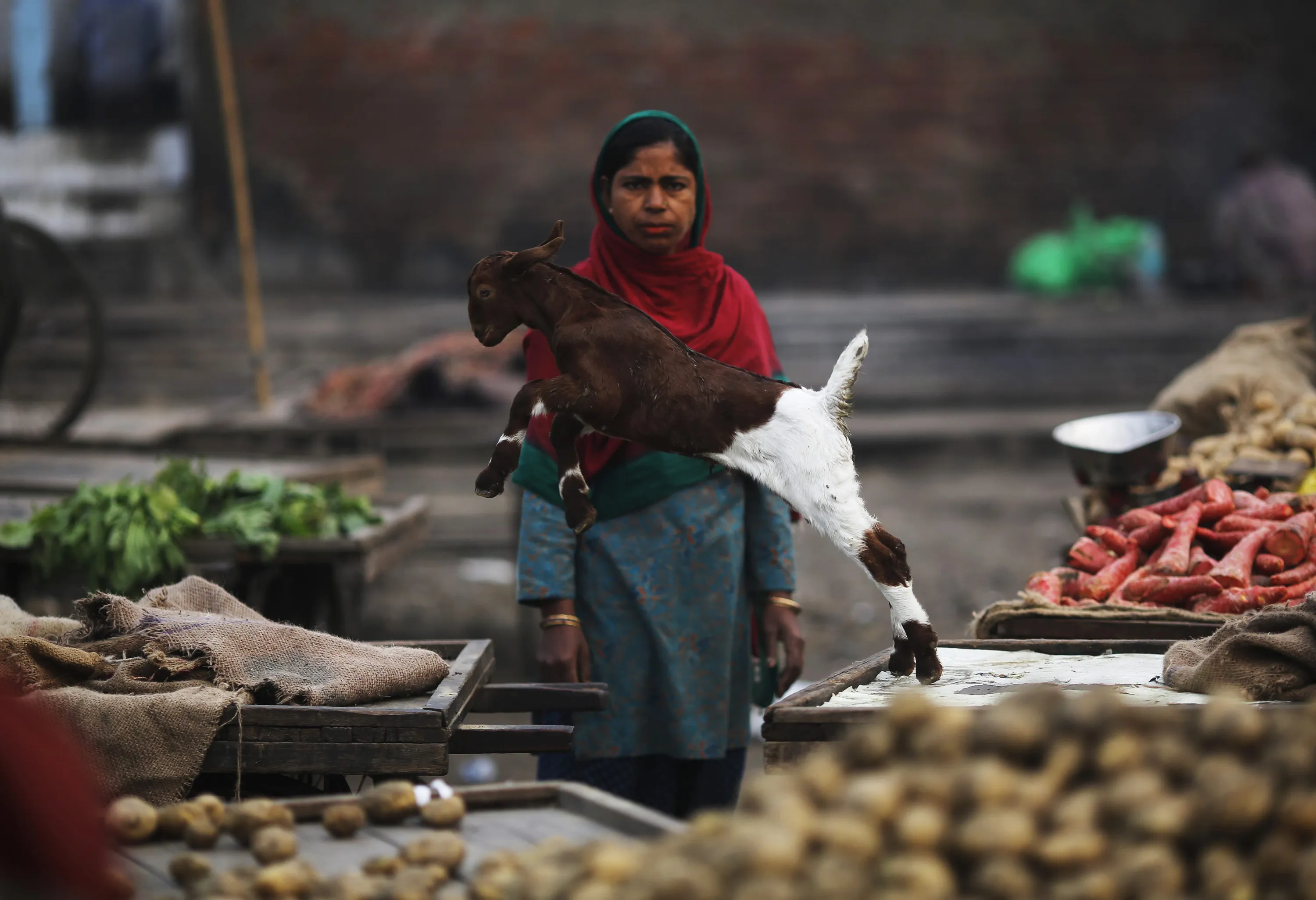 A goat takes a leap from one cart to another as a vendor watches at a wholesale vegetable market in the old quarters of Delhi February 19, 2015. (Photo by Adnan Abidi/Reuters)