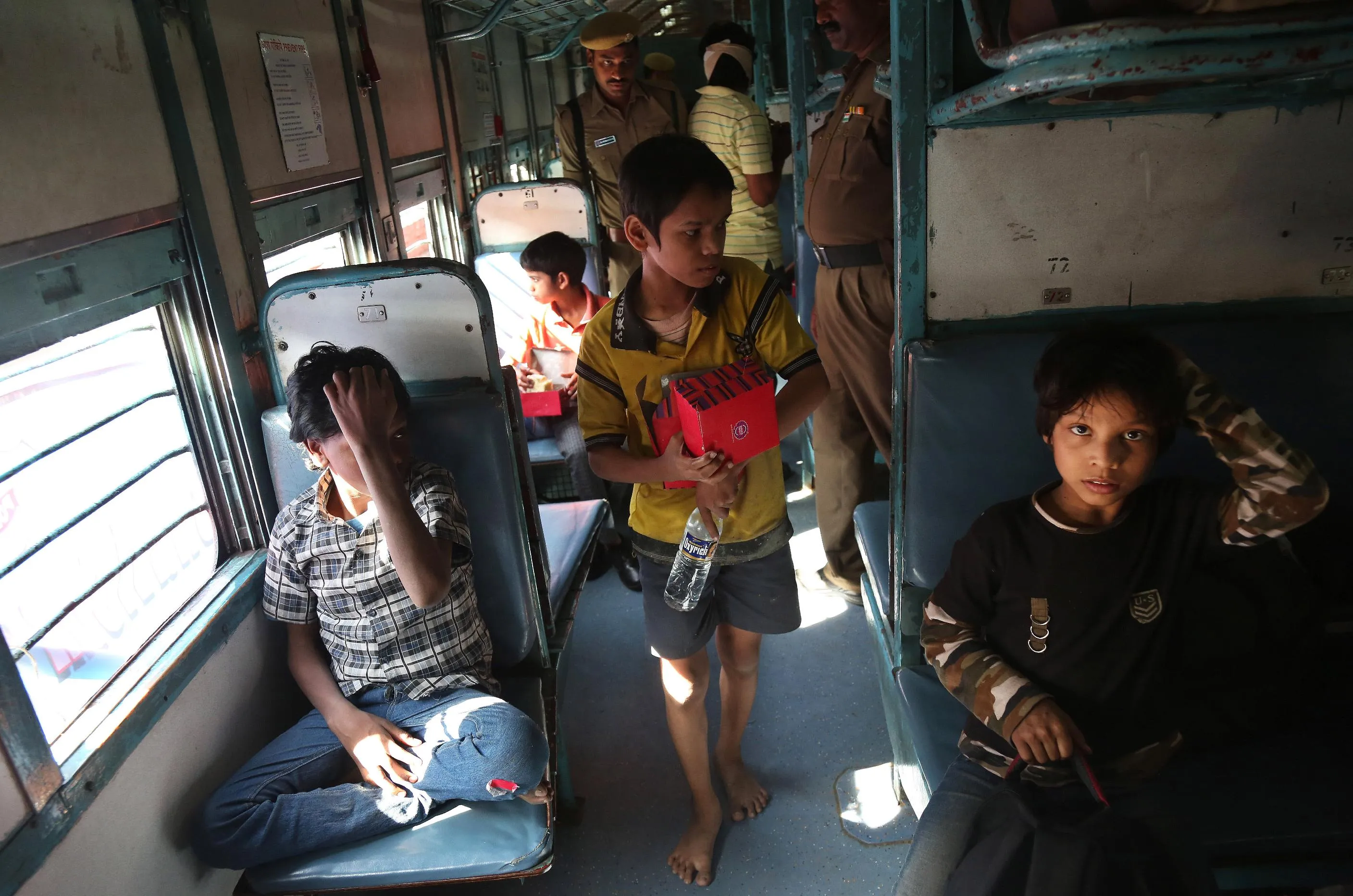 Indian rescued child laborers sit inside a train to be reunited with their parents in Bihar, one of India's poorest states, at a railway station in Hyderabad, India, Thursday, February 5, 2015. Police have rescued hundreds of children working in hazardous industries in a southern Indian city despite laws that ban child labor. In a series of raids on leather tanning and plastic factories in Hyderabad over the past 10 days, police rescued at least 350 children. (Photo by Mahesh Kumar A./AP Photo)