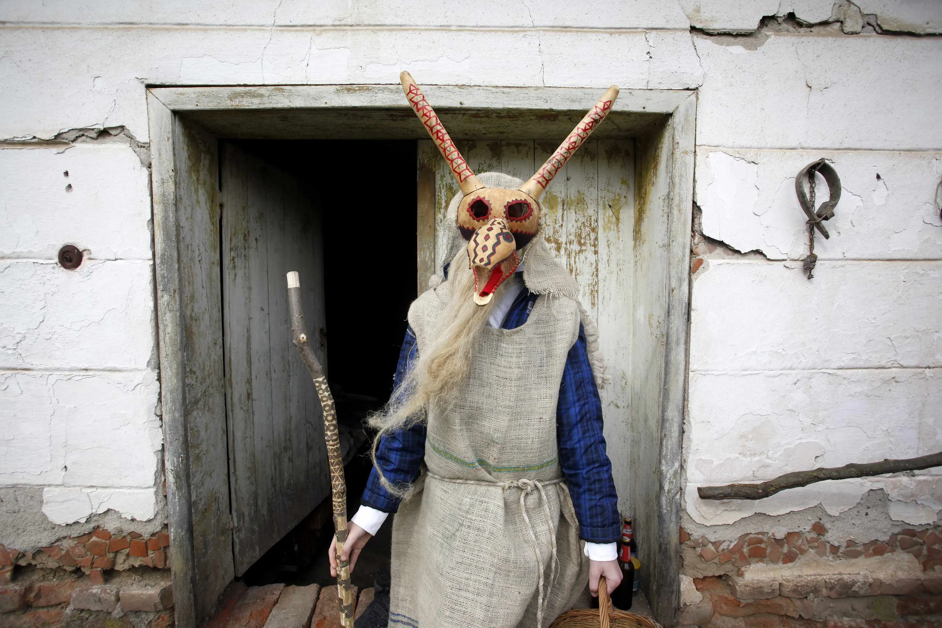 A boy wearing a mask stands in front of a house during Bele Poklade carnival celebrations in the village of Lozovik, some 100 km (62 miles) from the capital Belgrade, February 22, 2015. (Photo by Djordje Kojadinovic/Reuters)
