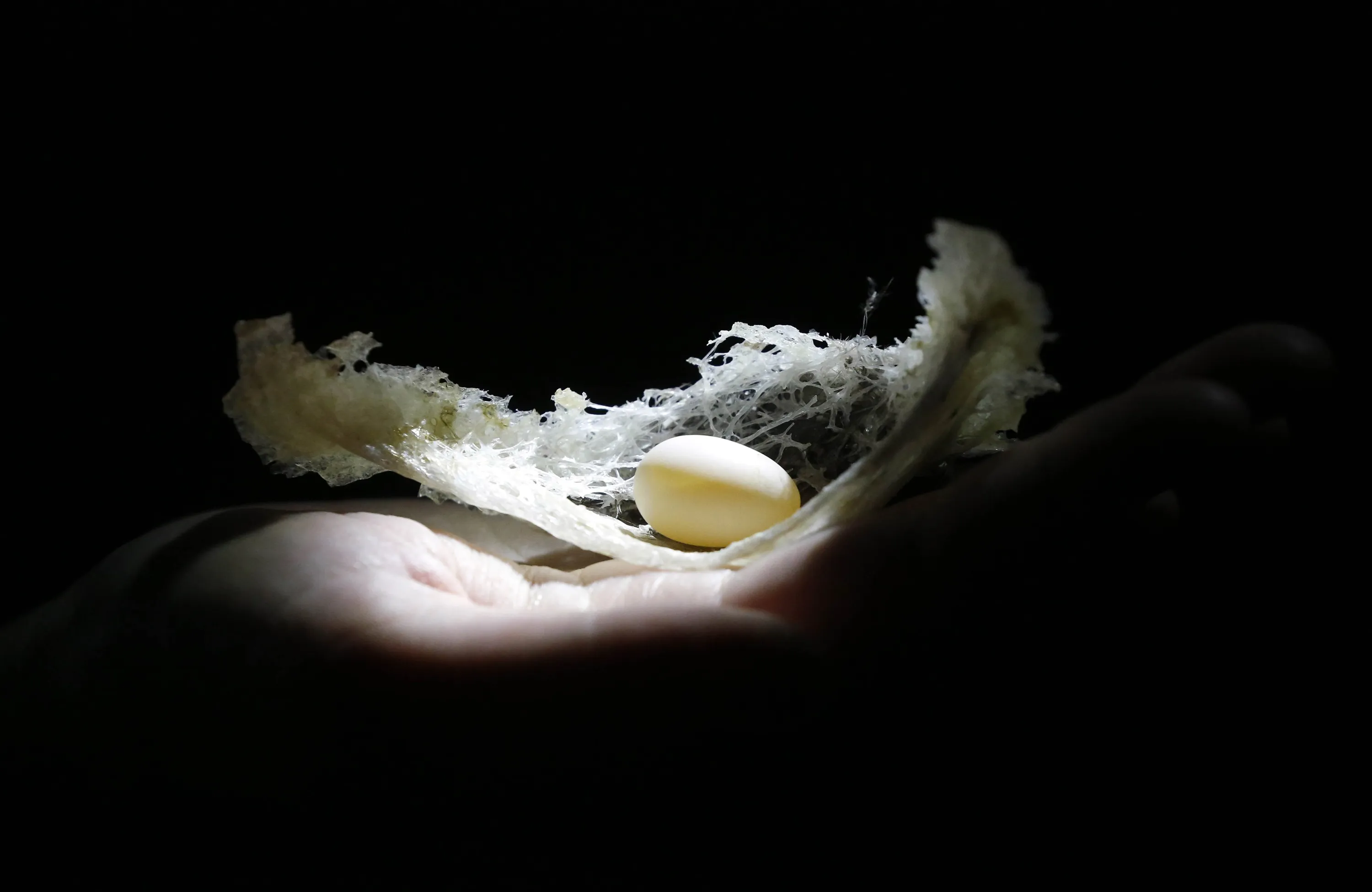Caretaker Tan Jin Hong poses with a bird's nest and egg at the Swiftlet Eco Park in Perak, northern Malaysia, February 14, 2015. (Photo by Olivia Harris/Reuters)