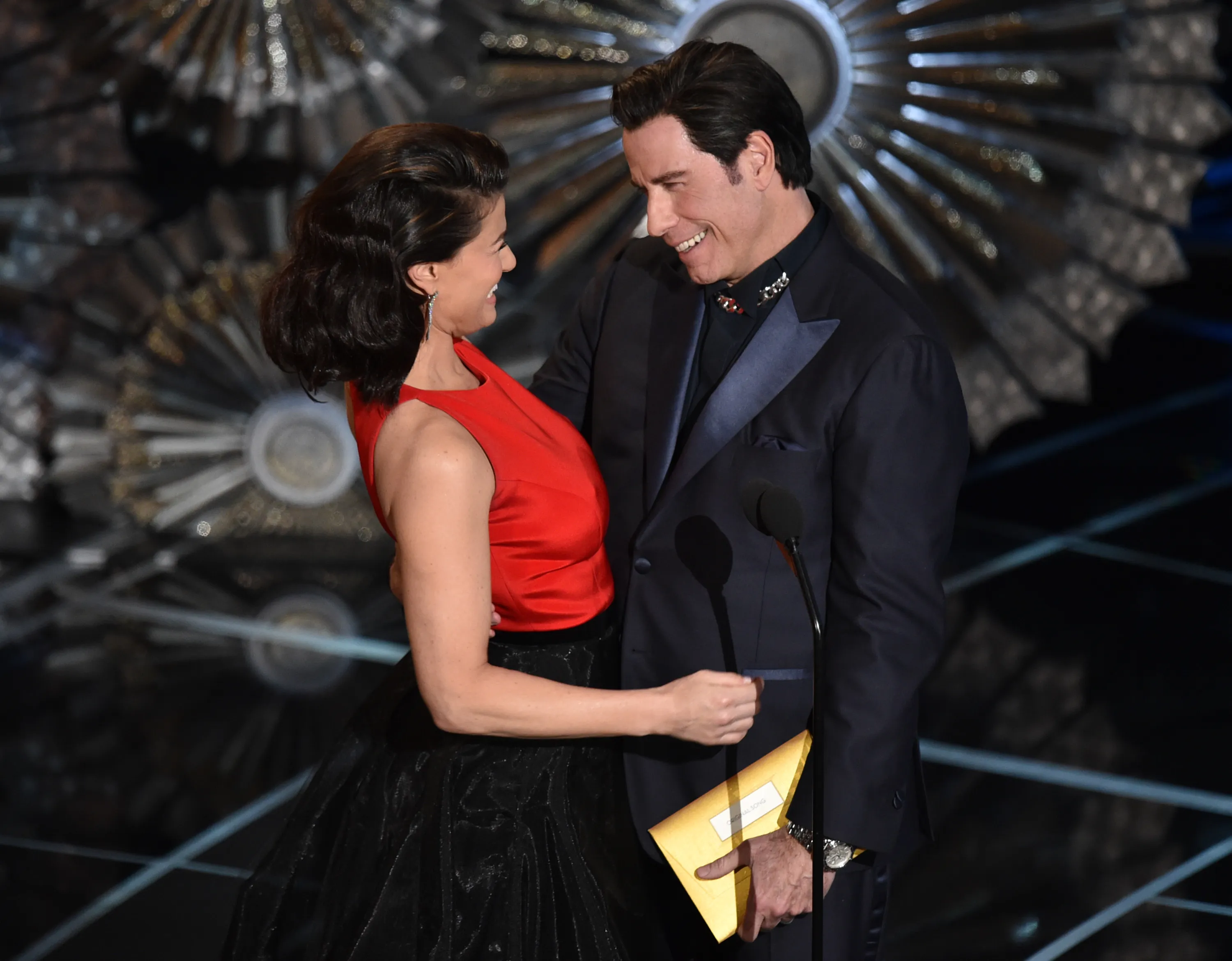 Idina Menzel, left and John Travolta present the award for best original song at the Oscars on Sunday, February 22, 2015, at the Dolby Theatre in Los Angeles. (Photo by John Shearer/Invision/AP Photo)