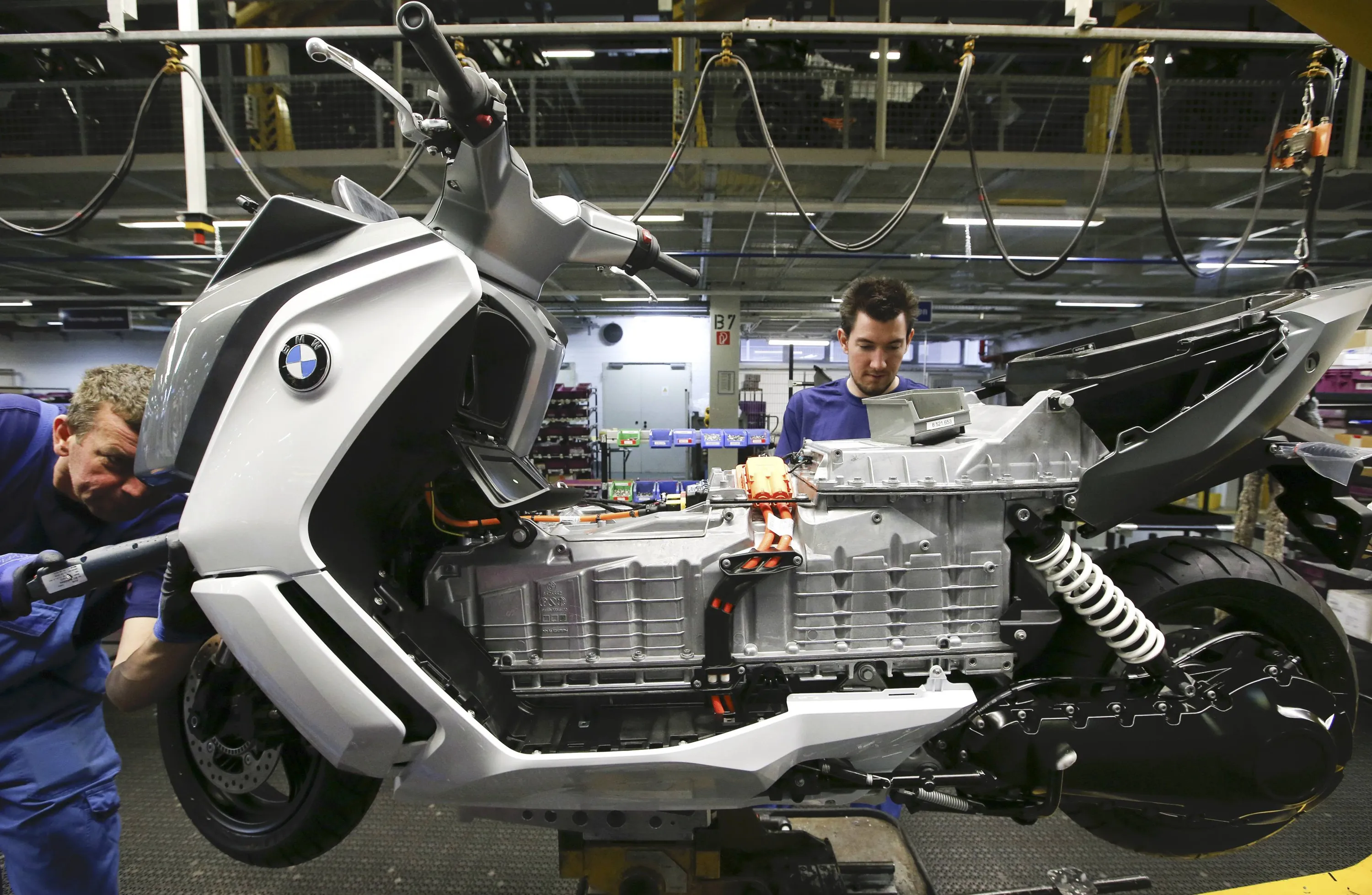 A mechanic assembles a BMW C evolution electric maxi-scooter at the BMW Berlin motorcycle plant February 23, 2015. (Photo by Fabrizio Bensch/Reuters)