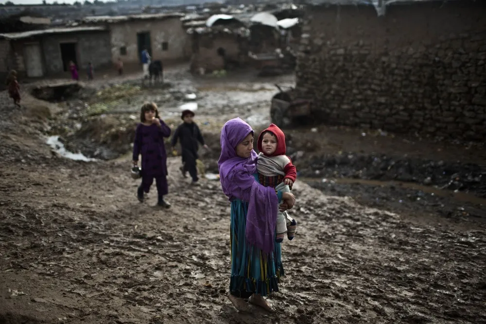 An Afghan refugee girl carries her younger brother as she walks with bare feet on slippery ground of a slum following rainfall on the outskirts of Islamabad, Pakistan, Thursday, February 19, 2015. (Photo by Muhammed Muheisen/AP Photo)