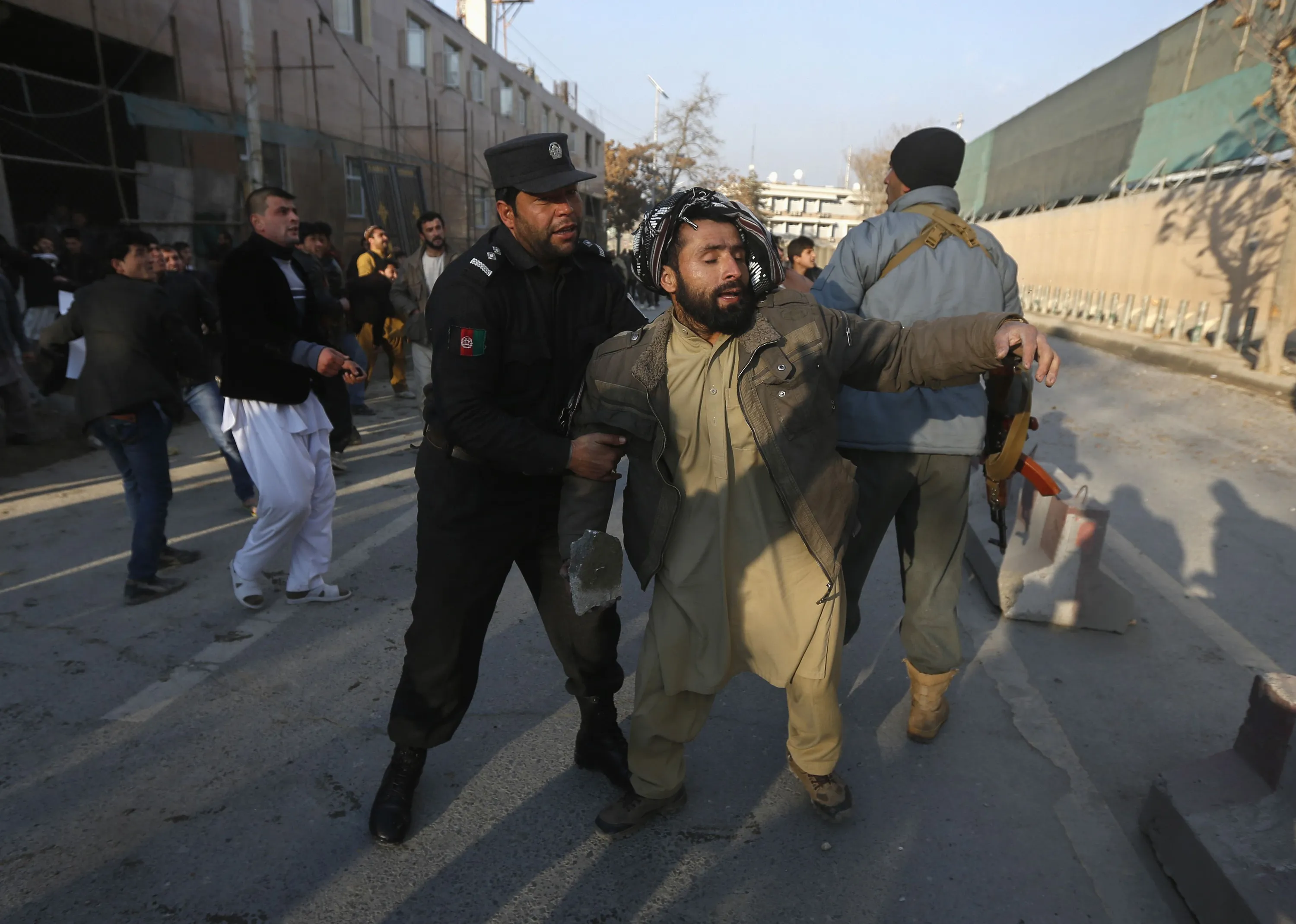 A police officer tries to stop an Afghan man who wants to throw a stone towards a U.S. compound during a demonstration against the satirical French weekly Charlie Hebdo's cartoons of the Prophet Mohammad, in Kabul, January 23, 2015. (Photo by Omar Sobhani/Reuters)