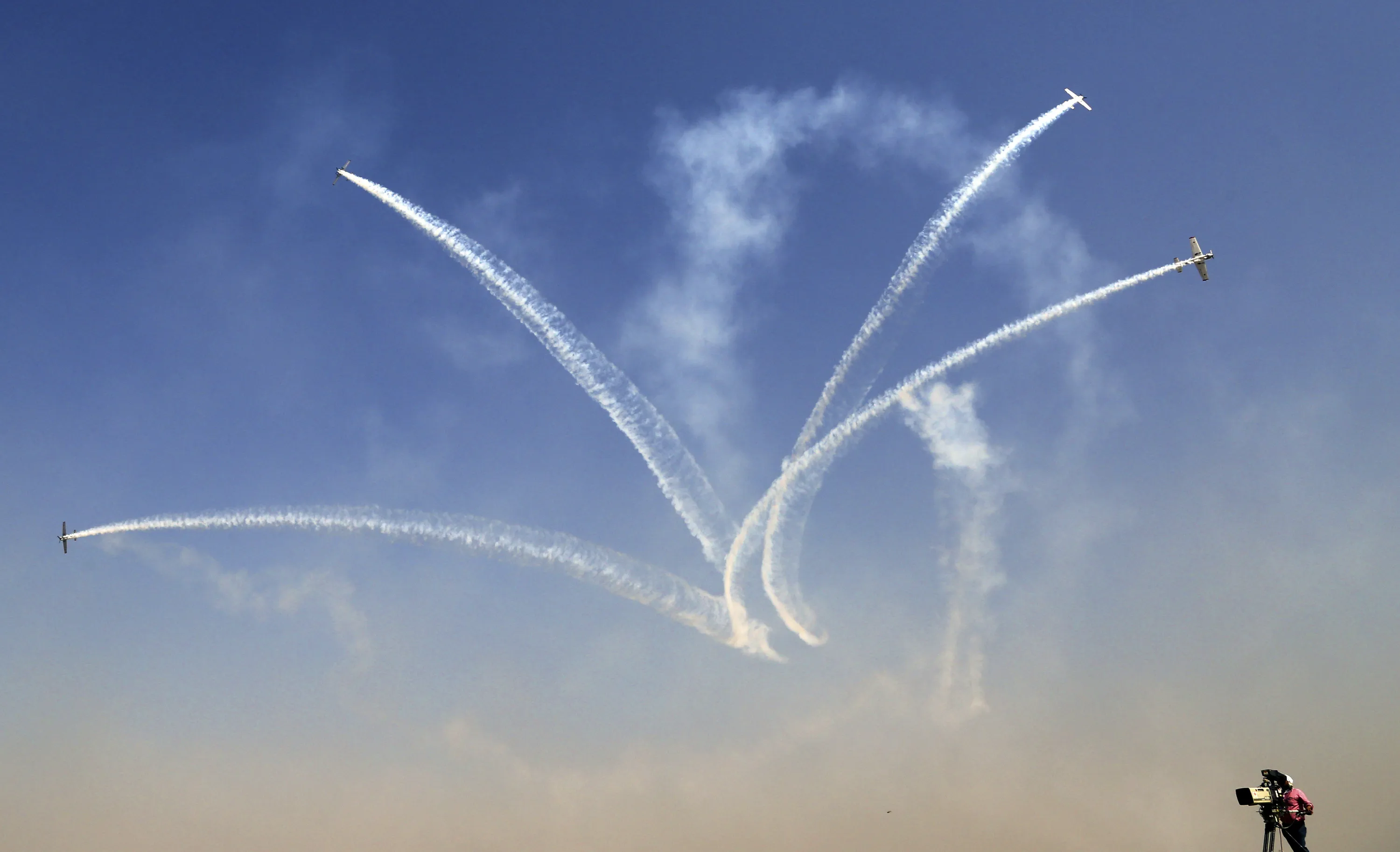 A cameraman films as Russian aerobatic team Yakovlev performs at the inaugural function of Aero India 2015 at Yelahanka air base in Bangalore, India, Wednesday, February 18, 2015. (Photo by Aijaz Rahi/AP Photo)