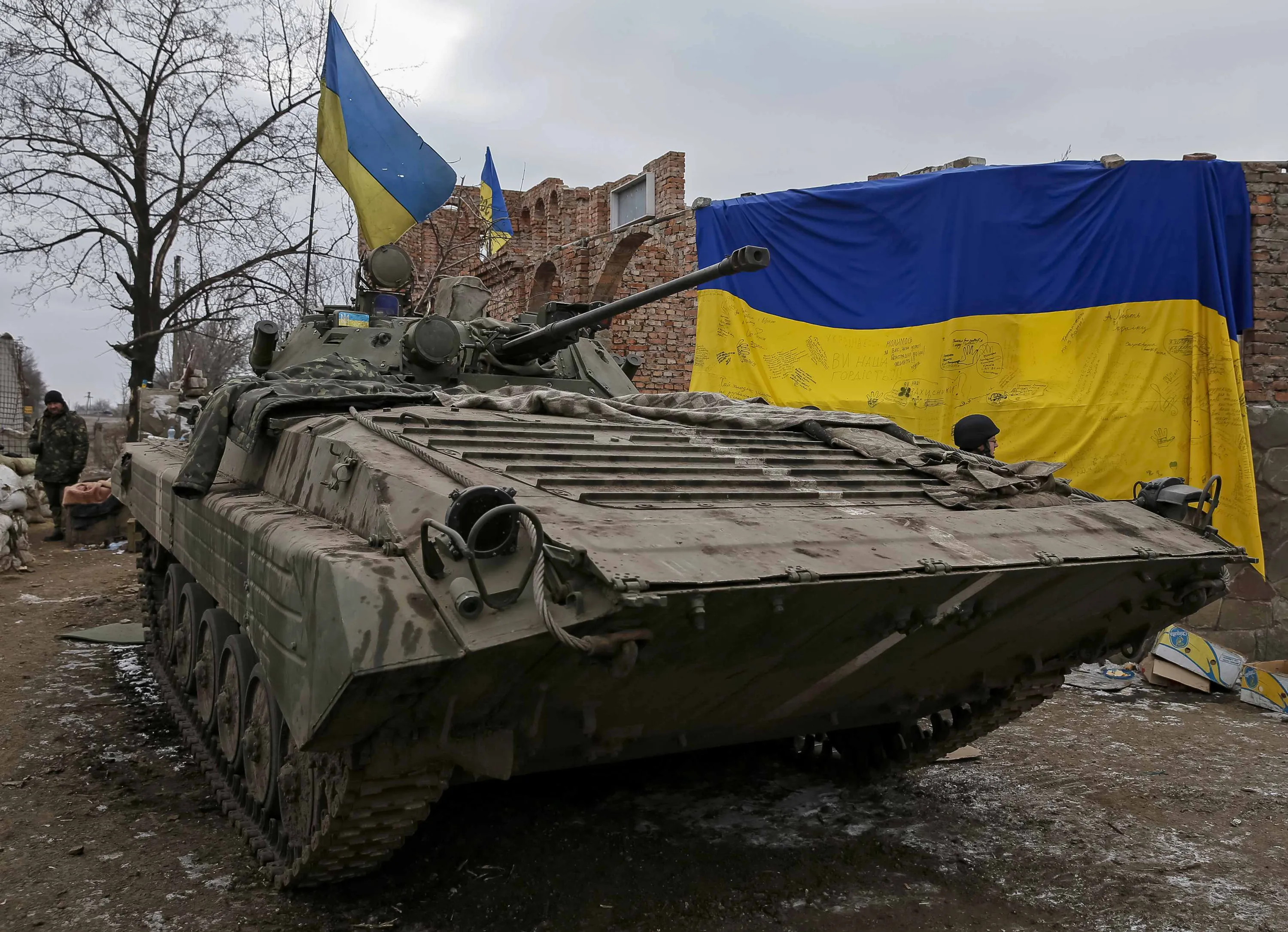 An armoured personnel carrier of the Ukrainian armed forces is seen near Debaltseve, eastern Ukraine, February 20, 2015. Fighting persisted in east Ukraine on Friday despite new European efforts to ensure a ceasefire takes hold. REUTERS/Gleb Garanich (UKRAINE - Tags: POLITICS CIVIL UNREST MILITARY CONFLICT TRANSPORT)