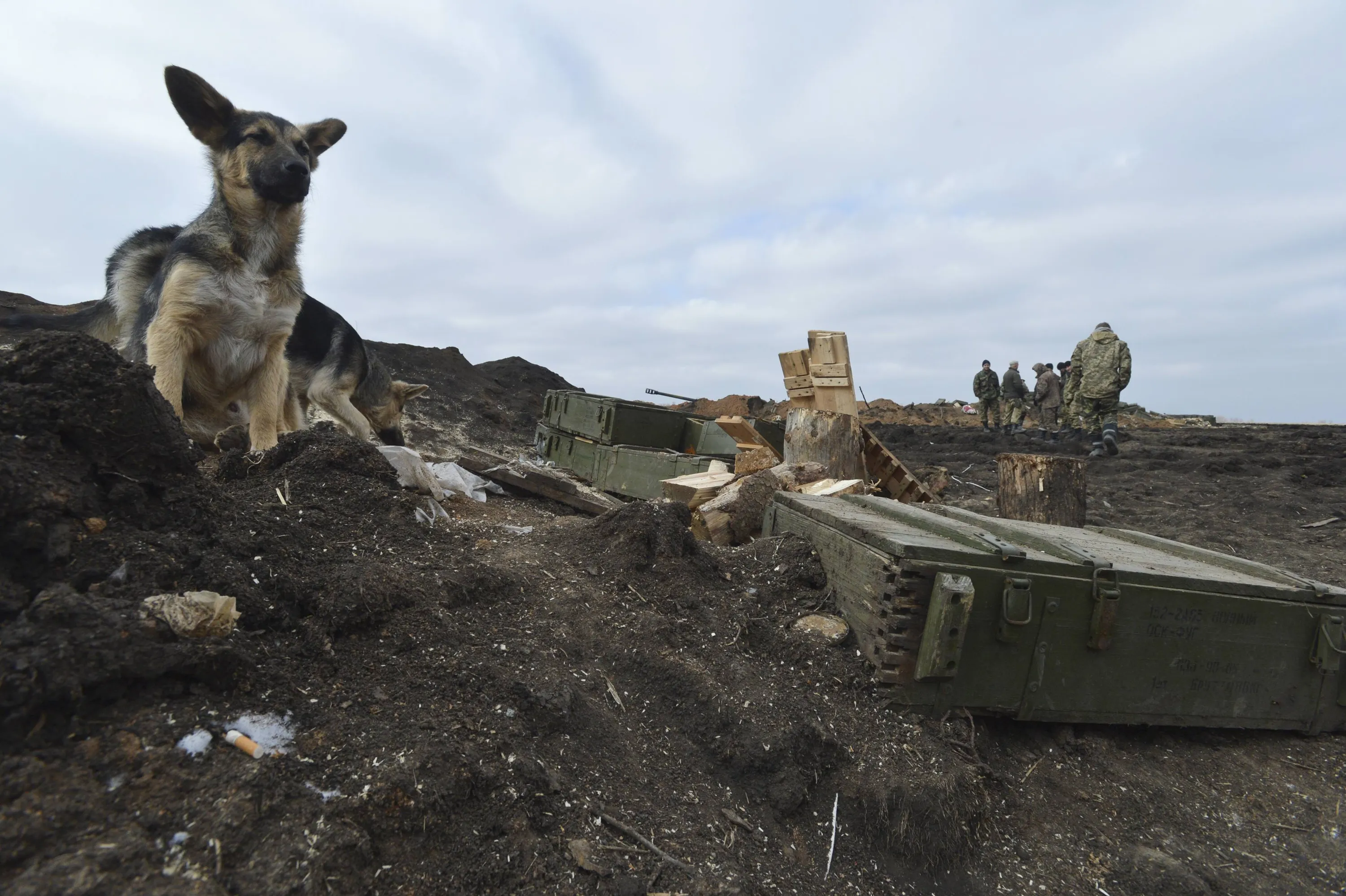 Dogs walk near boxes of shells at the positions of the Ukrainian armed forces in Donetsk region, eastern Ukraine, February 20, 2015. Kiev accused Russia on Friday of sending more tanks and troops into eastern Ukraine and said they were heading towards the rebel-held town of Novoazovsk on the southern coast, expanding their presence on what could be the next key battlefront.REUTERS/Oleksandr Klymenko (UKRAINE - Tags: MILITARY CIVIL UNREST CONFLICT ANIMALS)