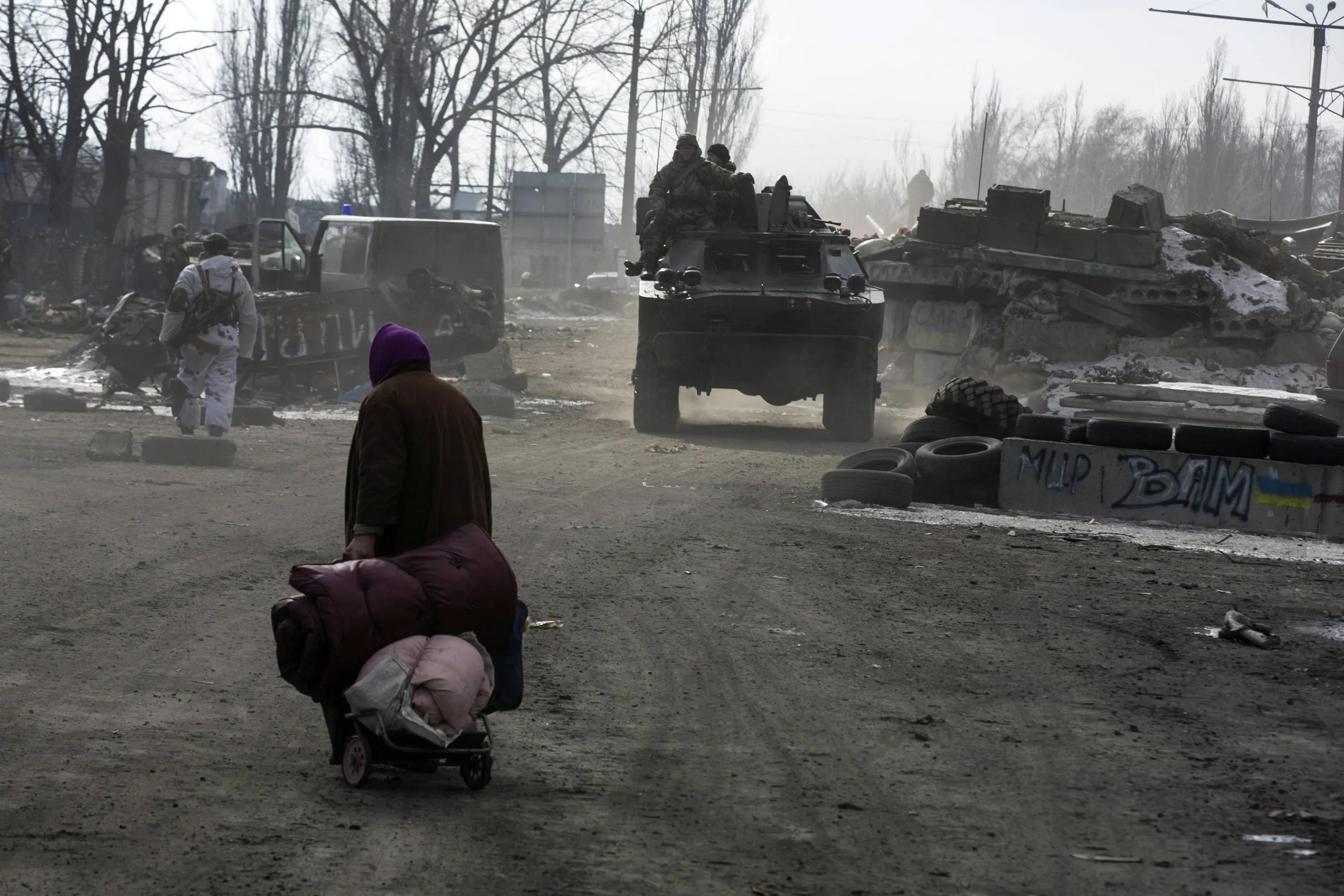 A woman carries her belongings in front of an armoured personnel carrier of the separatist self-proclaimed Donetsk People's Republic army in Debaltseve, February 20, 2015. REUTERS/Baz Ratner (UKRAINE - Tags: POLITICS CIVIL UNREST CONFLICT)