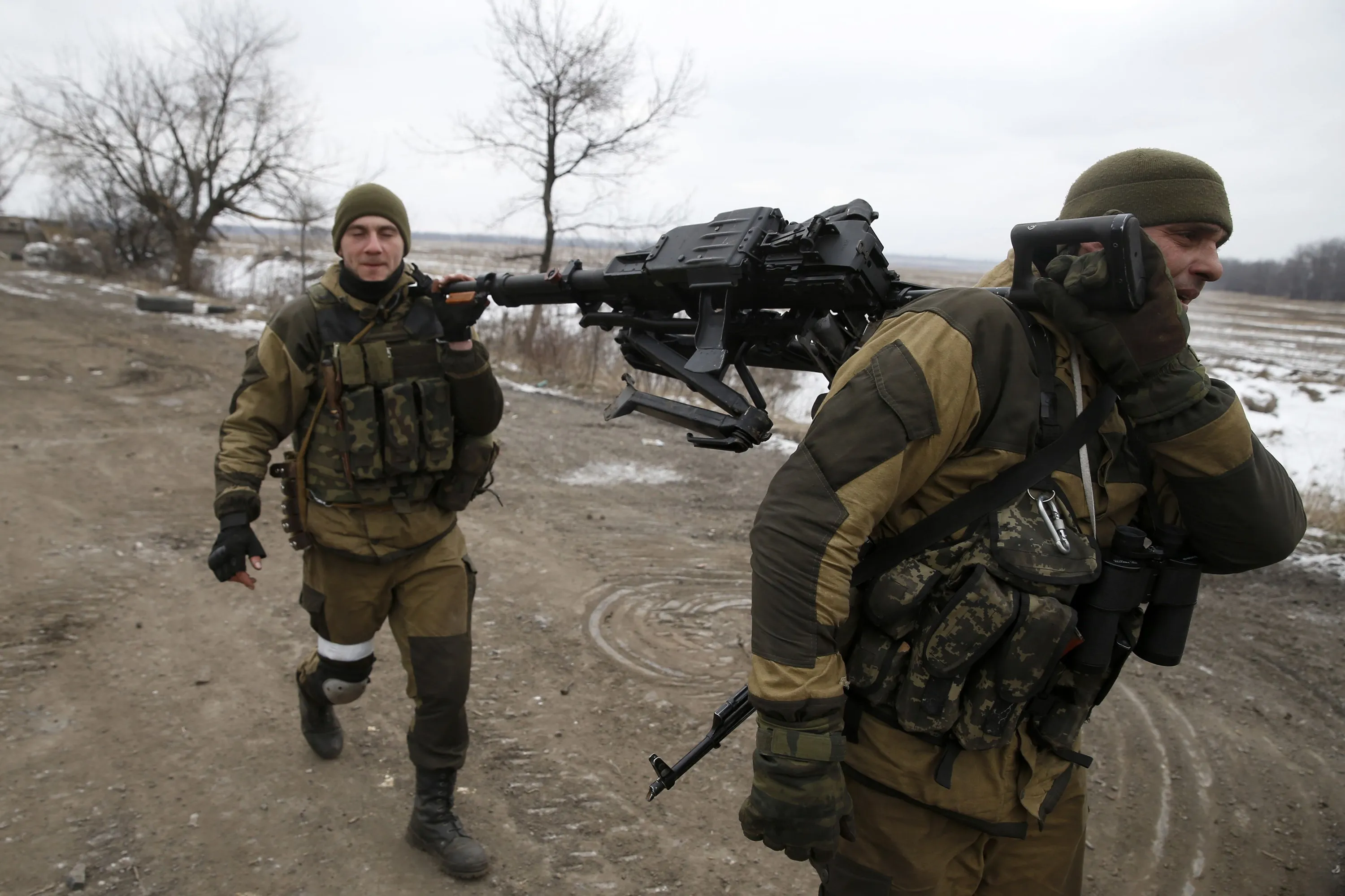 Fighters with the separatist self-proclaimed Donetsk People's Republic army carry a machine gun at a check point on the road from the town of Vuhlehirsk to Debaltseve, February 20, 2015.
