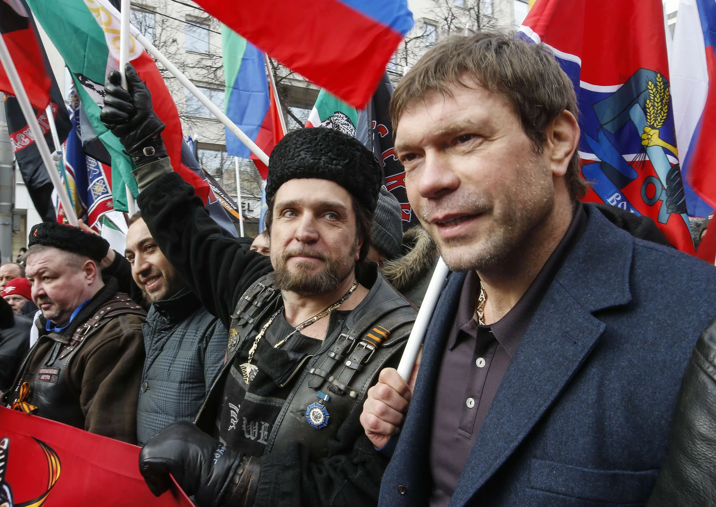 Pro-Russian politician Oleg Tsarev (R) and leader of the motorcycling club Night Wolves Alexander Zaldostanov (C) attend an "Anti-Maidan" rally to protest against the 2014 Kiev uprising, which ousted President Viktor Yanukovich, in Moscow February 21, 2015. Thousands of Russians marched in Moscow on Saturday, carrying banners and signs disavowing the protests at Kiev's Independence Square, or Maidan, last year that ousted a Russian-backed president and created a rift between Ukraine and the West and Russia. REUTERS/Sergei Karpukhin (RUSSIA - Tags: POLITICS CIVIL UNREST)