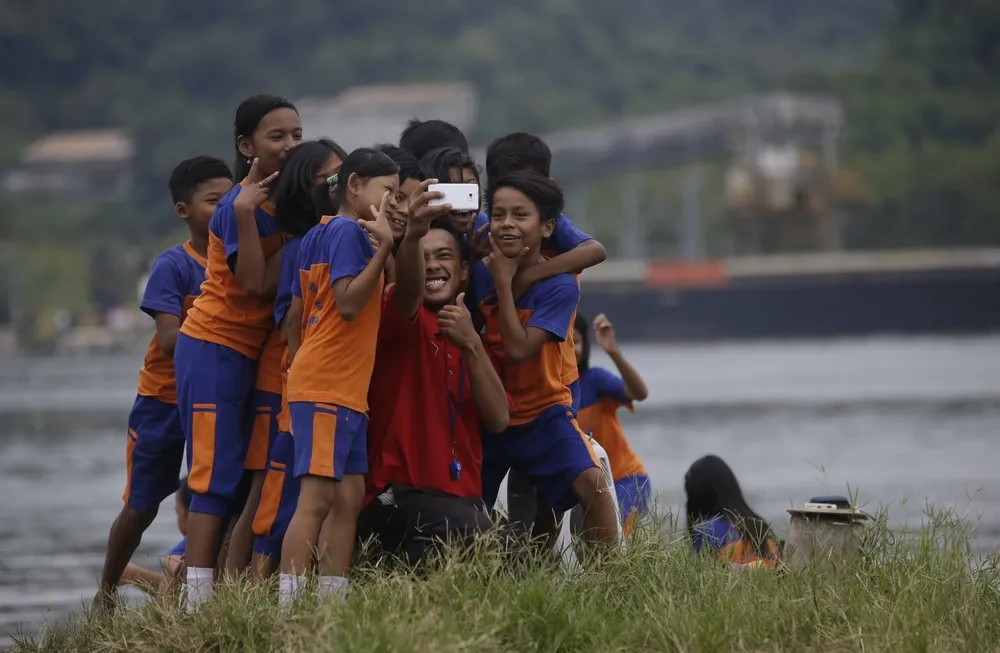 A teacher and students take a selfie at Wijaya Pura port in Cilacap, Central Java, Indonesia, Thursday, March 5, 2015. (AP Photo/Achmad Ibrahim)
