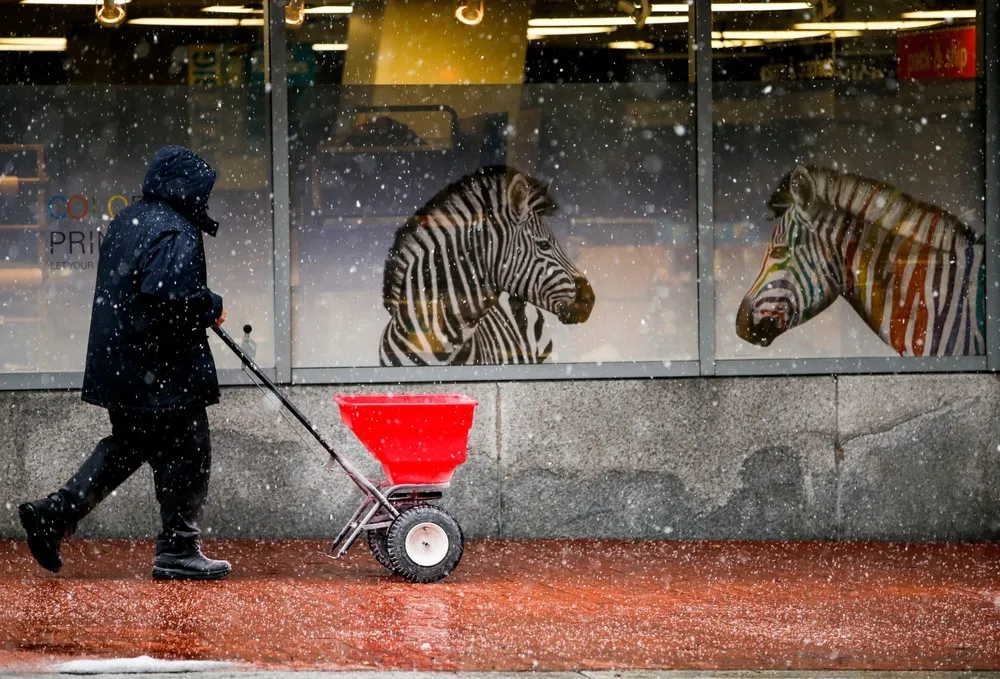 A man salts a downtown sidewalk in Washington, Thursday, March 5, 2015, as snow begins to fall. The U.S. federal government said its offices in the Washington area will be closed Thursday because of a new round of winter weather expected in the region. The Office of Personnel Management said non-emergency personnel in and around Washington were granted excused absences for the day. Emergency employees and telework-ready employees were expected to work. (AP Photo/Andrew Harnik)