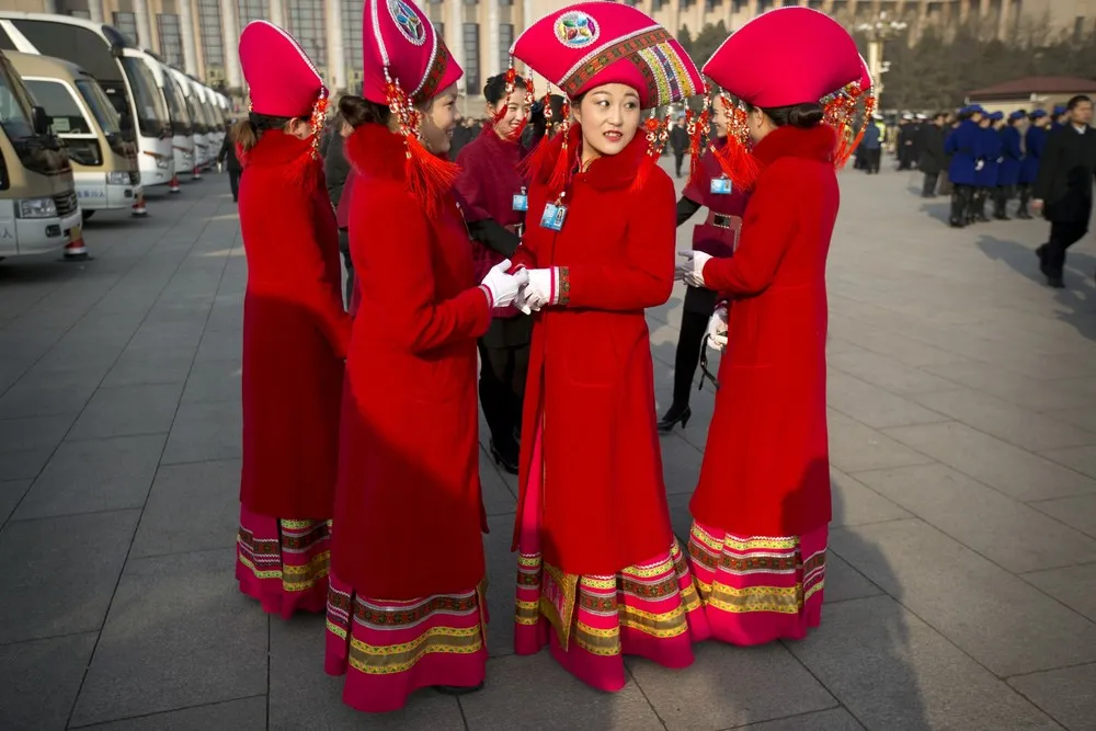 Hostesses gather outside the Great Hall of the People during the opening session of the annual National People's Congress in Beijing, Thursday, March 5, 2015.China announced a lower economic growth target for this year and promised to open more industries to foreign investors as it tries to make its slowing, state-dominated economy more productive. (AP Photo/Mark Schiefelbein)