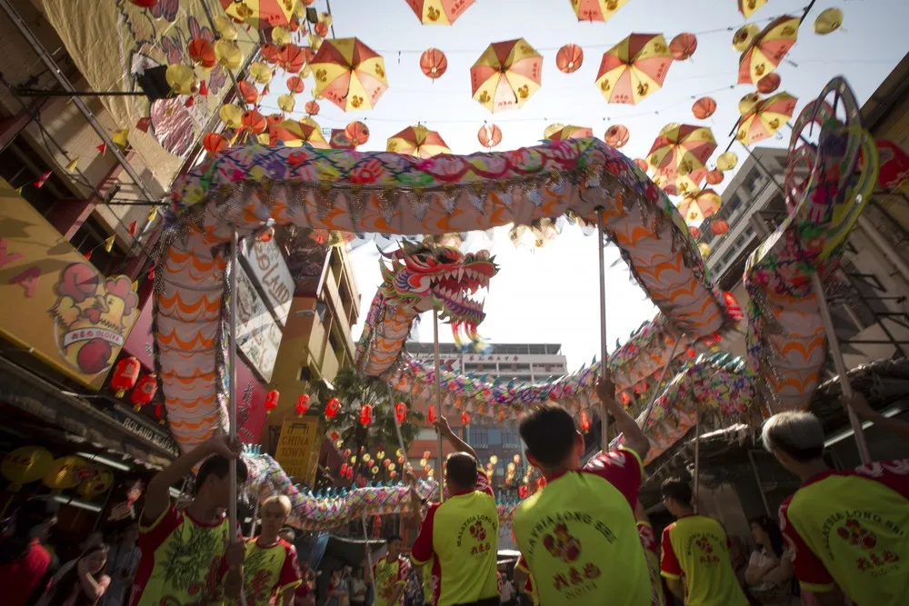 A dragon dance is performed at China Town on the last day of the Chinese Lunar New Year celerations in Kuala Lumpur, Malaysia, Thursday, March 5, 2015. (AP Photo/Vincent Thian)