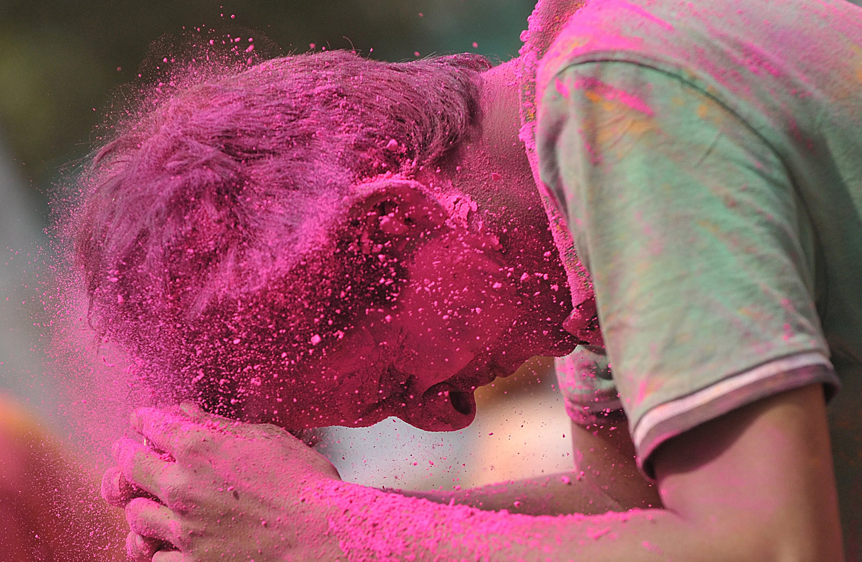 Indian revellers play with coloured powder during Holi celebrations in Hyderabad on March 6, 2015. Holi, also called the Festival of Colours, is a popular Hindu spring festival observed in India at the end of the winter season on the last full moon day of the lunar month. AFP PHOTO / Noah SEELAM (Photo credit should read NOAH SEELAM/AFP/Getty Images)