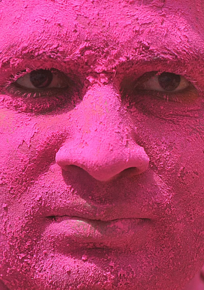Indian reveller is covered with coloured powder during Holi celebrations in Hyderabad on March 6, 2015. Holi, also called the Festival of Colours, is a popular Hindu spring festival observed in India at the end of the winter season on the last full moon day of the lunar month. AFP PHOTO / Noah SEELAM (Photo credit should read NOAH SEELAM/AFP/Getty Images)