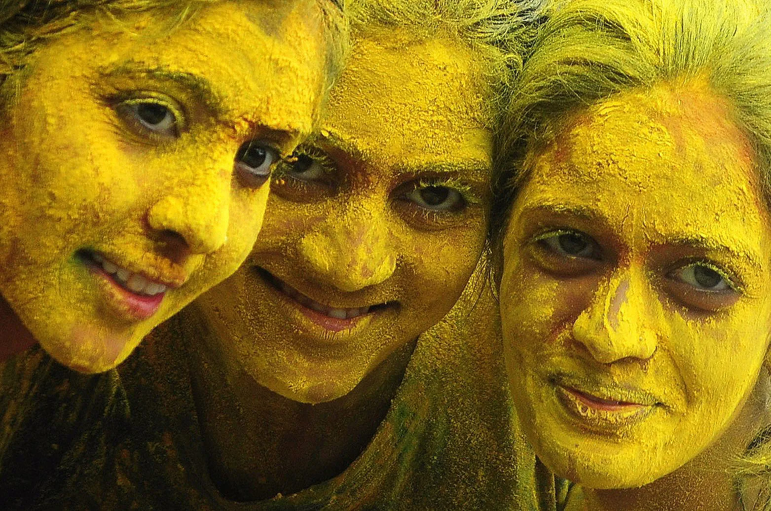epa04649963 Indian revellers smeared with colors dance to Bollywood and local tunes during the Holi Festival in Bangalore, India, 06 March 2015. Holi is celebrated at the end of the winter season on the last full moon day of the lunar month Phalguna (February or March) and its main day is celebrated by people throwing colored powder and colored water at each other. EPA/JAGADEESH NV