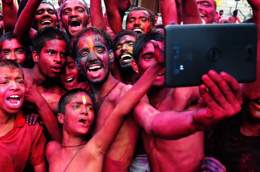 epa04649961 Indian revellers smeared with colors take selfies during the Holi Festival in Bangalore, India, 06 March 2015. Holi is celebrated at the end of the winter season on the last full moon day of the lunar month Phalguna (February or March) and its main day is celebrated by people throwing colored powder and colored water at each other. EPA/JAGADEESH NV