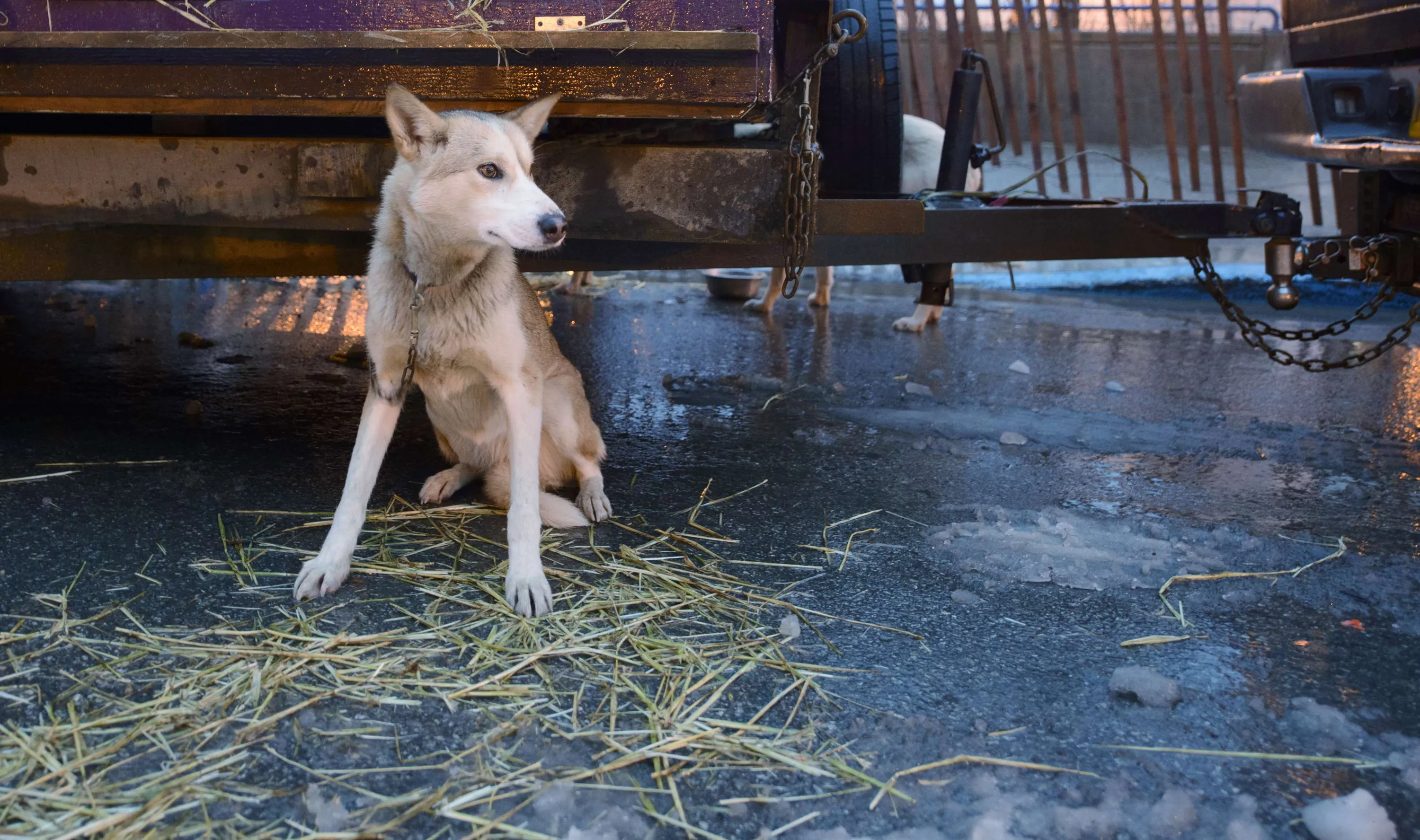 A dog from Katherine Keith's team awaits for the 2015 ceremonial start of the Iditarod Trail Sled Dog race in downtown Anchorage, Alaska March 7, 2015. The timed portion of the race, which typically lasts nine days or longer, begins on Monday in Fairbanks, about 300 miles (482 km) away. Traditionally held in Willow, the timed start was moved to Fairbanks this year to accommodate an alternate trail selected after race officials deemed sections of the traditional path unsafe. REUTERS/Mark Meyer (UNITED STATES - Tags: SPORT ANIMALS SOCIETY)