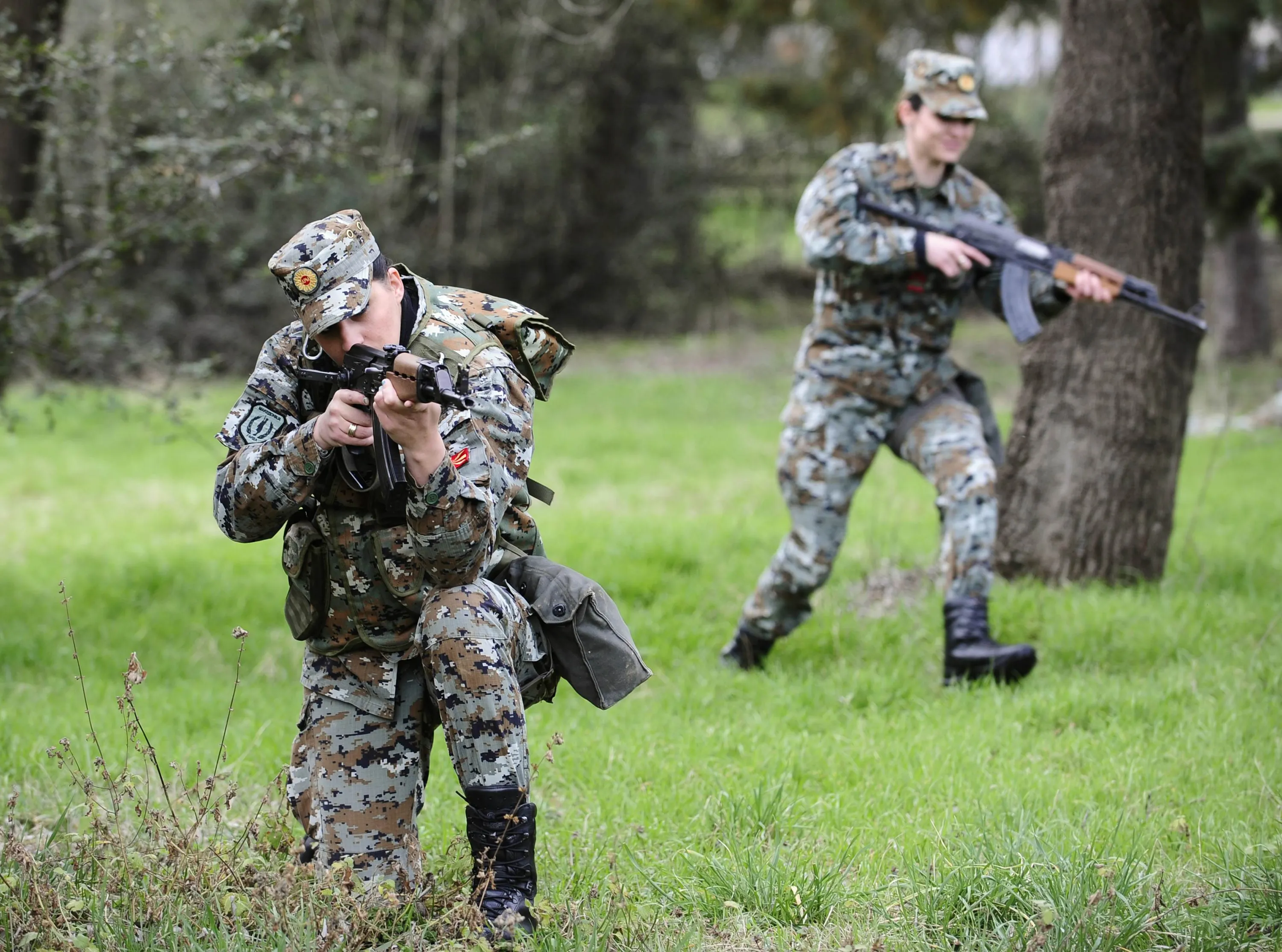 Corporals Verica Zlatevska (L) and Dragana Kitanovska attend an honour guard training session at an army barracks in Skopje March 4, 2015. Macedonia's honour army battalion, the ceremonial uniformed guard that receives every foreign president, dignitaries and delegations, but also sees off and welcomes the head of state every time he leaves the country, has a different glow. For the first time in the history of Macedonia's army, the honour guard has two women in its ranks. There has not been an event in which one of them is not in the first row. Zlatevska joined the army in 2003, Kitanovska in 2006. Picture taken March 4, 2015. REUTERS/Ognen Teofilovski (MACEDONIA - Tags: MILITARY SOCIETY)