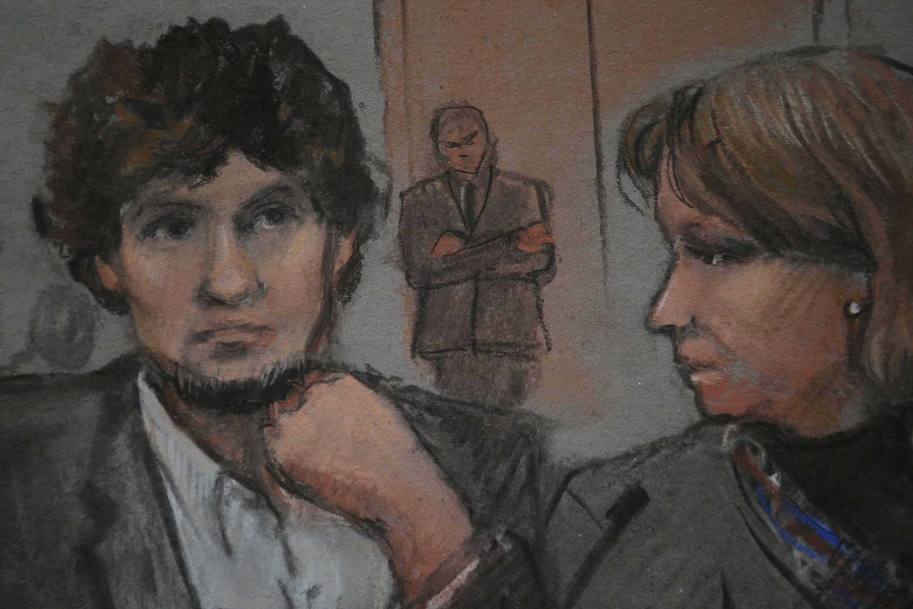 A courtroom sketch shows accused Boston Marathon bomber Dzhokhar Tsarnaev (L) in court on the second day of his trial at the federal courthouse in Boston, Massachusetts March 5, 2015. Tsarnaev, 21, is accused of killing three people and injuring 264 with a pair of homemade pressure-cooker bombs on April 15, 2013 at the Boston Marathon finish line. REUTERS/Jane Flavell Collins
