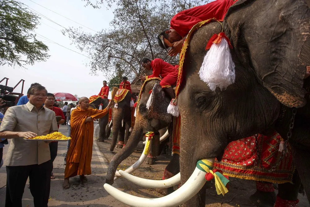 A Thai Buddhist monk blesses elephants on Thailand's National Elephant Day in the ancient Thai capital Ayutthaya March 13, 2015. (Photo by Athit Perawongmetha/Reuters)