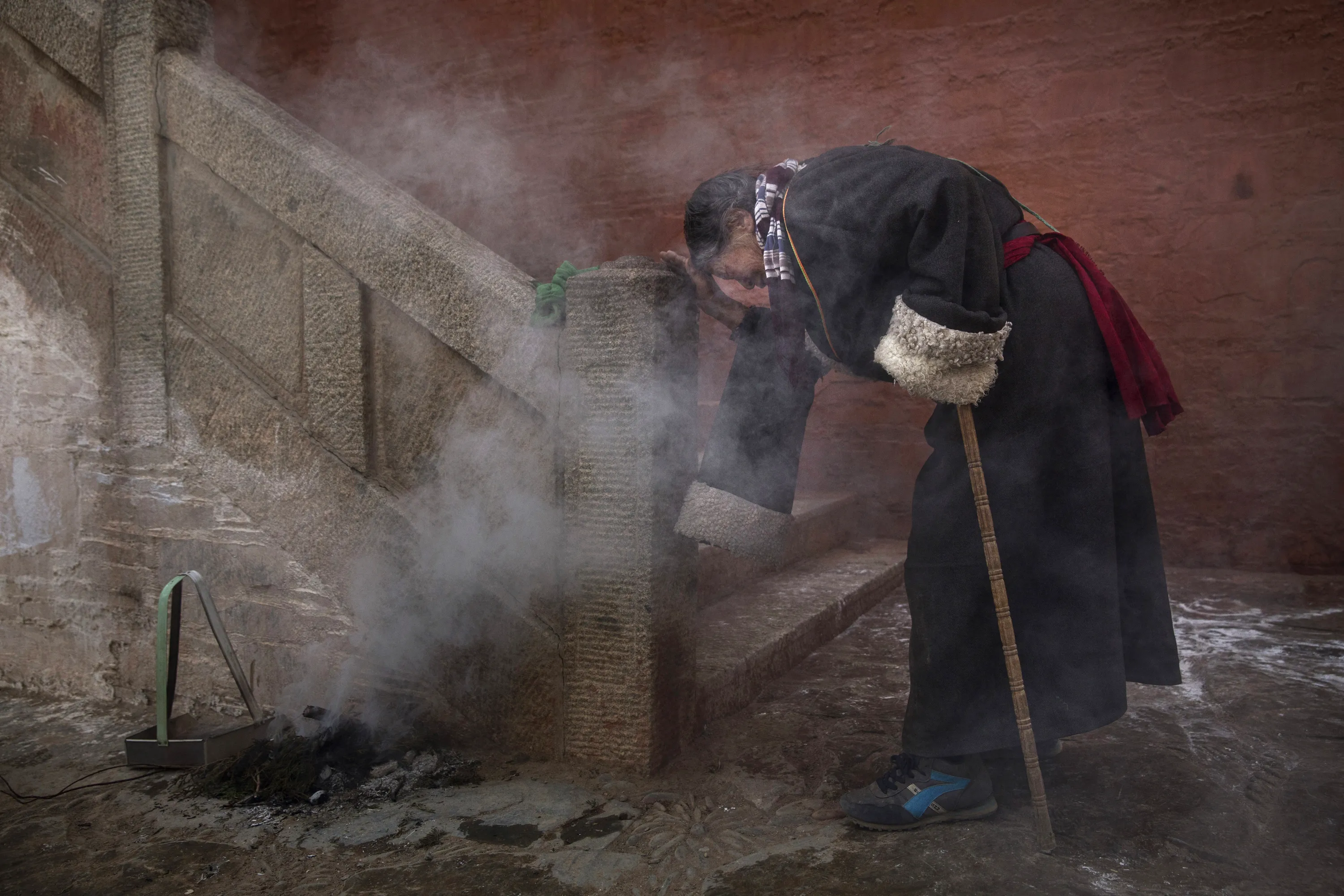 A Tibetan Buddhist woman prays in juniper smoke during Monlam or the Great Prayer rituals on March 3, 2015 at the Labrang Monastery, Xiahe County, Amdo, Tibetan Autonomous Prefecture, Gansu Province, China. (Photo by Kevin Frayer/Getty Images)