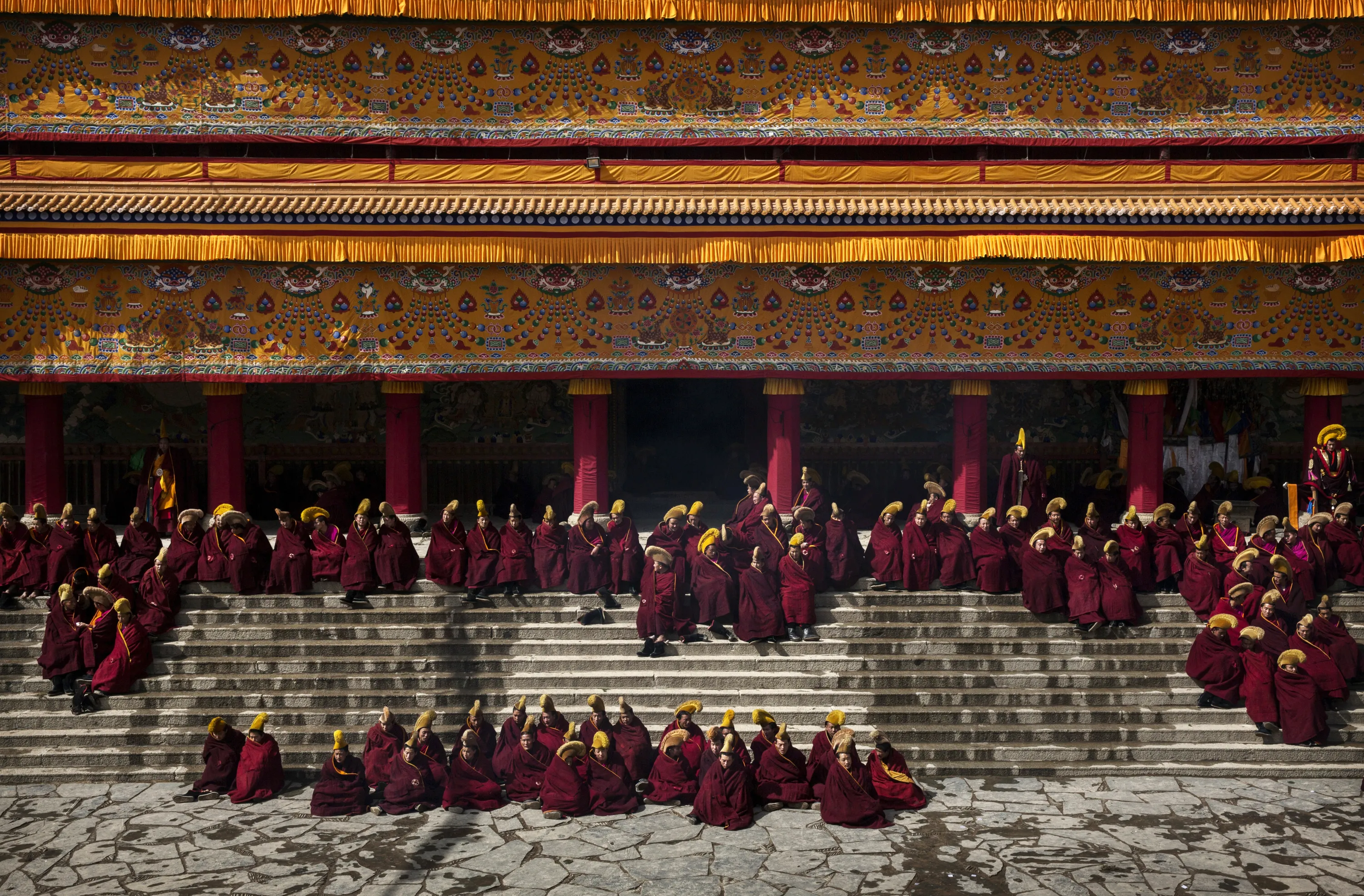 Tibetan Buddhist monks gather during Monlam or the Great Prayer rituals on March 5, 2015 at the Labrang Monastery, Xiahe County, Amdo, Tibetan Autonomous Prefecture, Gansu Province, China. (Photo by Kevin Frayer/Getty Images)