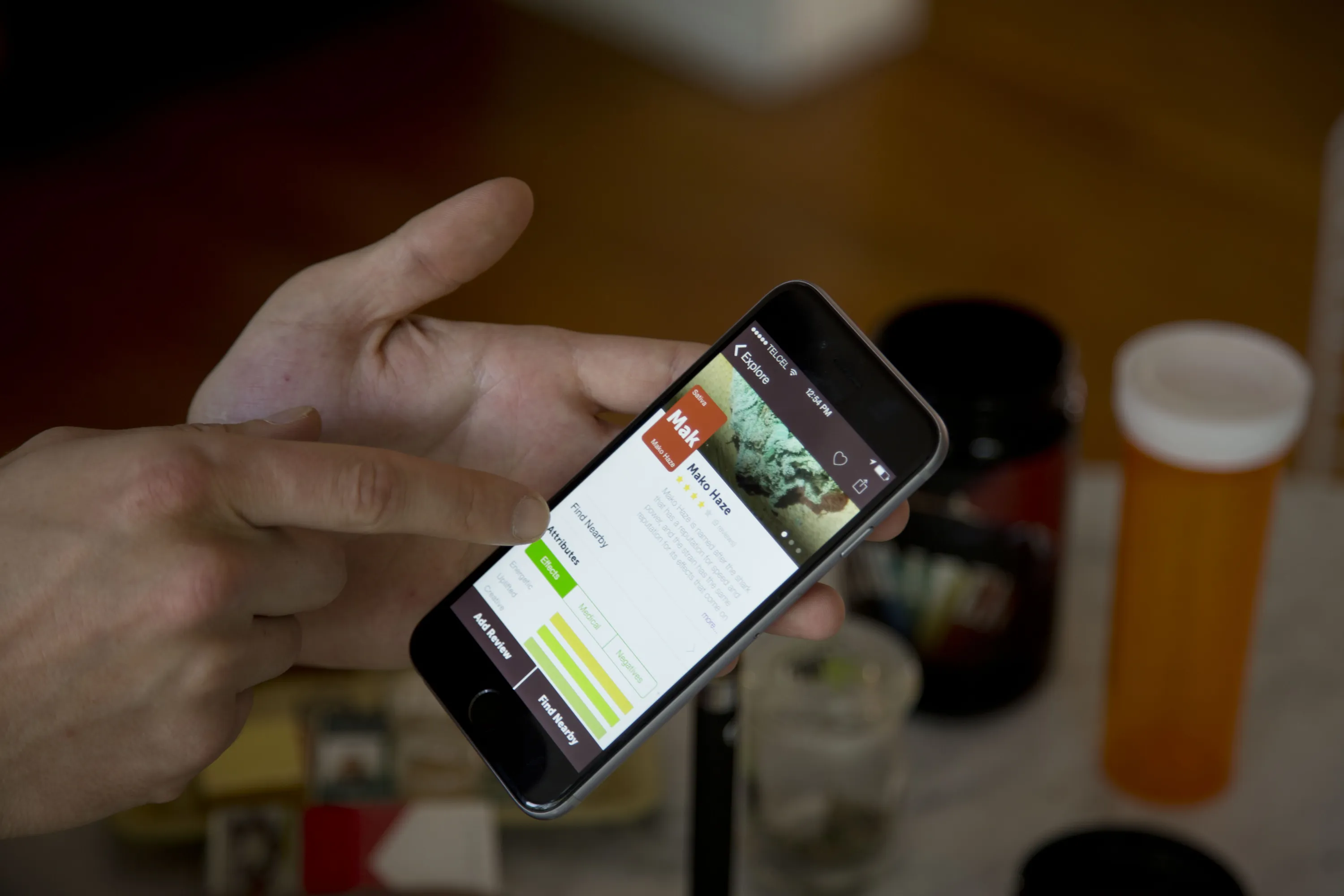 In this March 3, 2015, pot club member Homero Fernandez shows a smart phone app that details the properties of different marijuana varieties in Mexico City. A U.S. Drug Enforcement Administration official told NPR in December that Mexican cartel operatives were smuggling in high-end U.S. marijuana to sell to wealthy customers, though there's no sign so far of a massive southward trade. (Photo by Eduardo Verdugo/AP Photo)