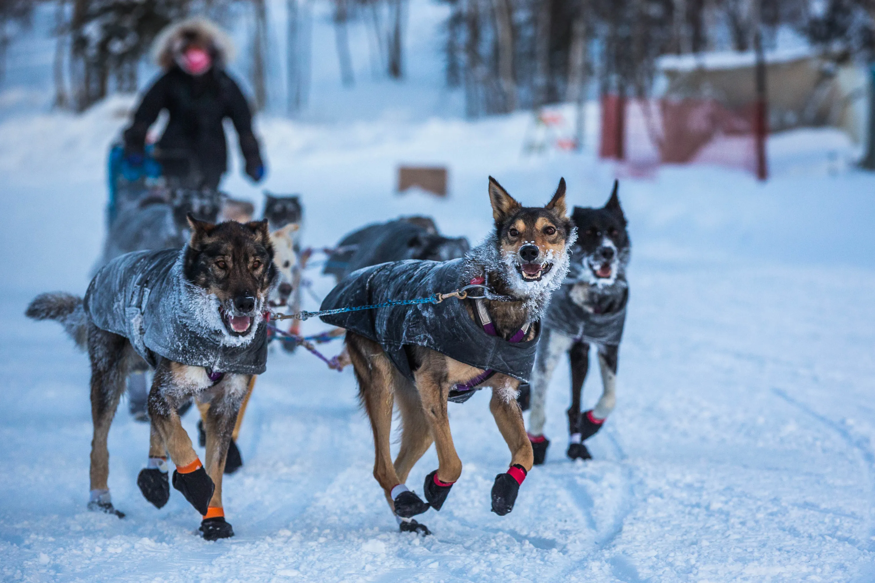 In this Friday, March 13, 2015, Jessie Royer and her team arrive at the Huslia, Alaska, checkpoint for the Iditarod Trail Sled Dog Race. (Photo by Loren Holmes/AP Photo/Alaska Dispatch News)