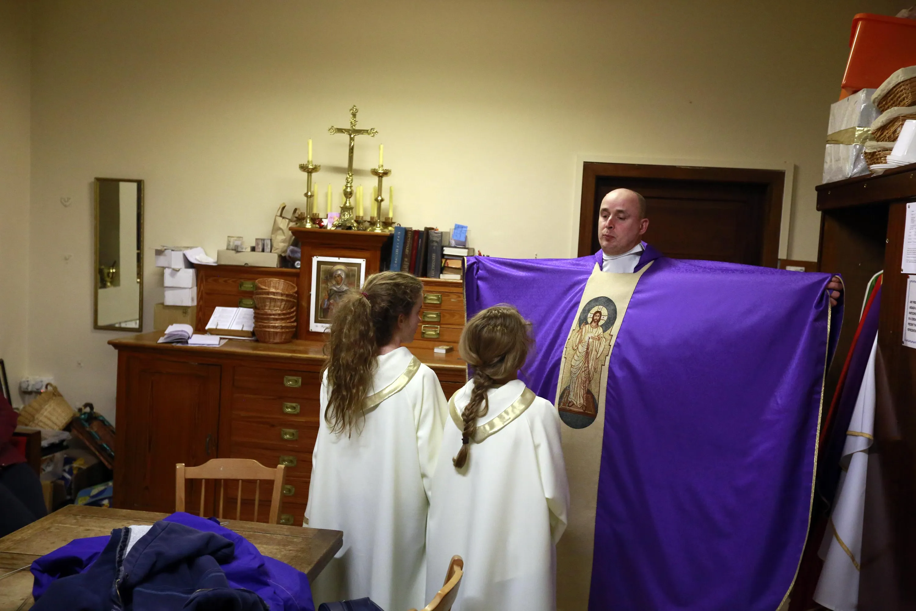 Fr Pierre Pepper puts on his vestments in the Sacristy of St Rynagh's Roman Catholic Church in the village of Banagher County Offaly March 2 , 2015. Fr Pepper has spent the last two months training for an amateur boxing match to raise proceeds for charity. (Photo by Cathal McNaughton/Reuters)