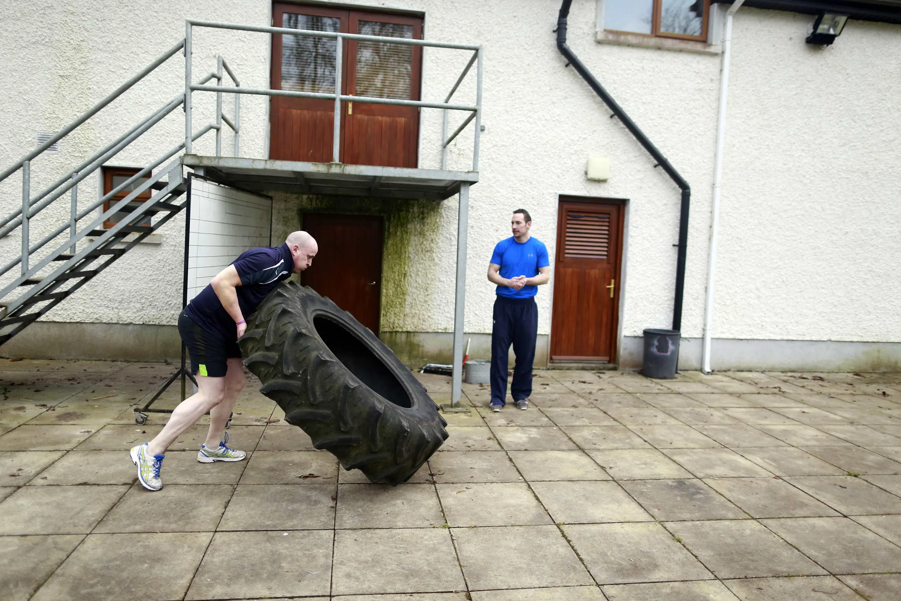 Fr Pierre Pepper turns over a tractor tyre during training at the Aspire gymnasium in the town of Clara County Offaly February 12, 2015. (Photo by Cathal McNaughton/Reuters)