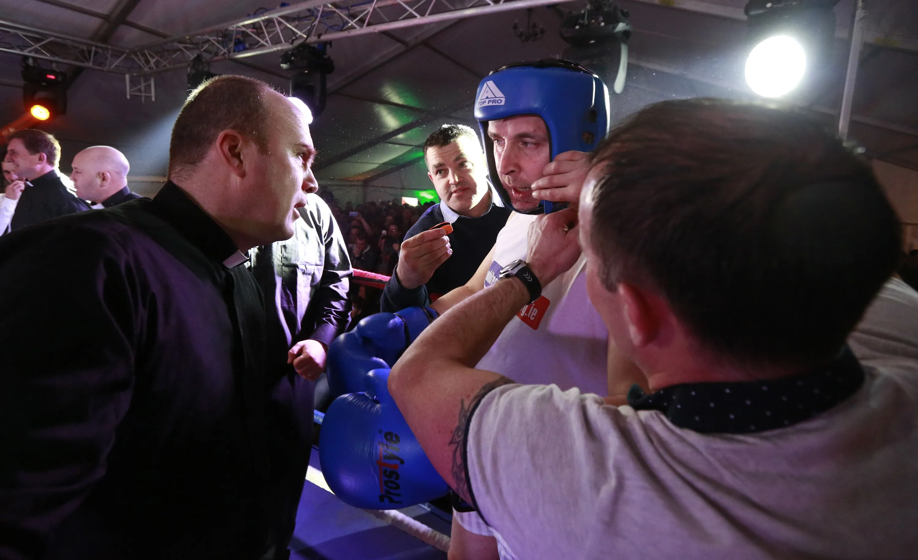 Fr Pierre Pepper (2nd R) receives instructions before defeating Jared Madden during his amateur boxing match in the town of Banagher in County Offaly March 15, 2015. (Photo by Cathal McNaughton/Reuters)