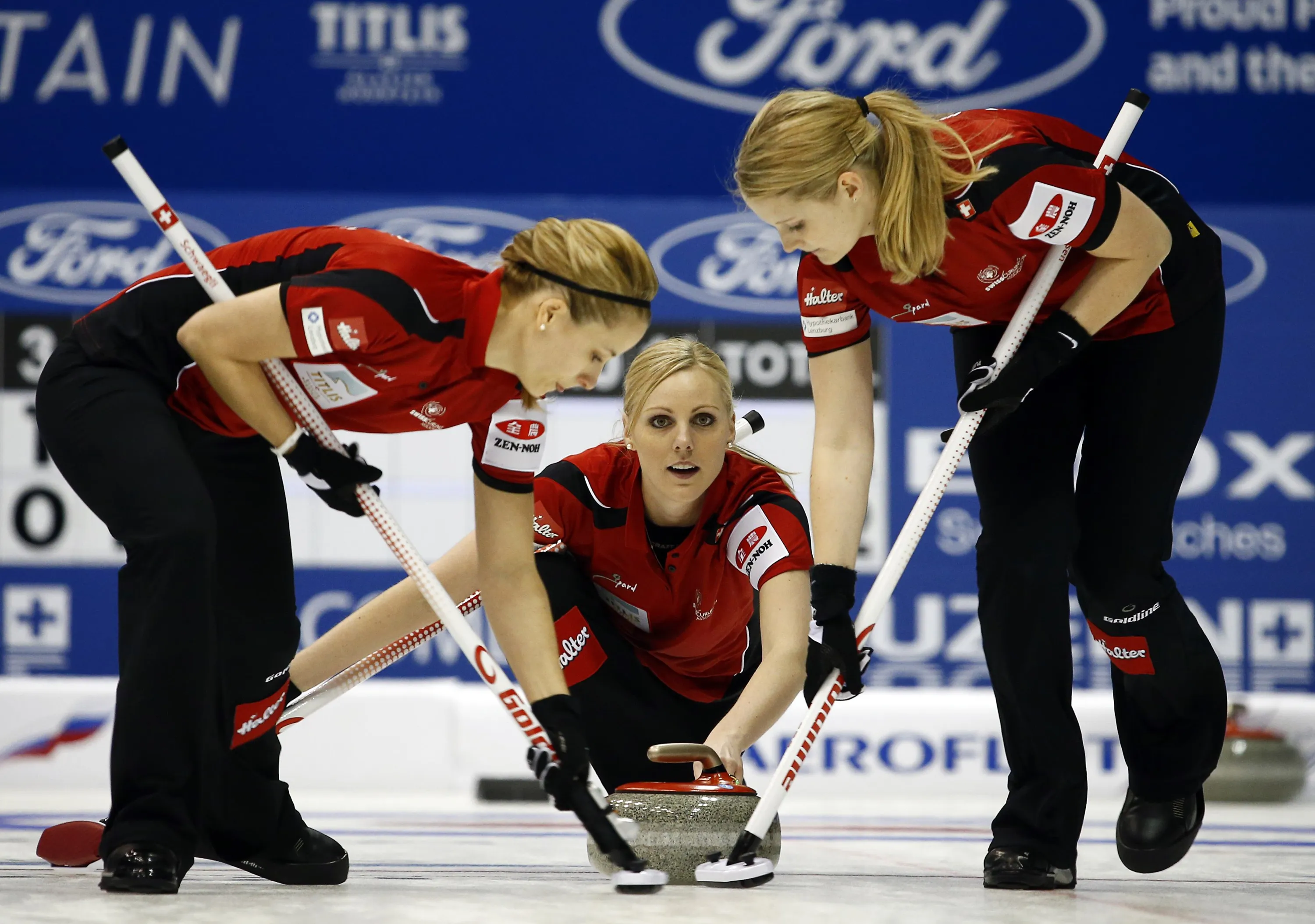 Switzerland's Nadine Lehmann (C) delivers a stone as her teammates Nicole Schwaegli (L) and Marisa Winkelhausen sweep during their curling round robin game against Germany at the World Women's Curling Championships in Sapporo March 15, 2015. (Photo by Thomas Peter/Reuters)