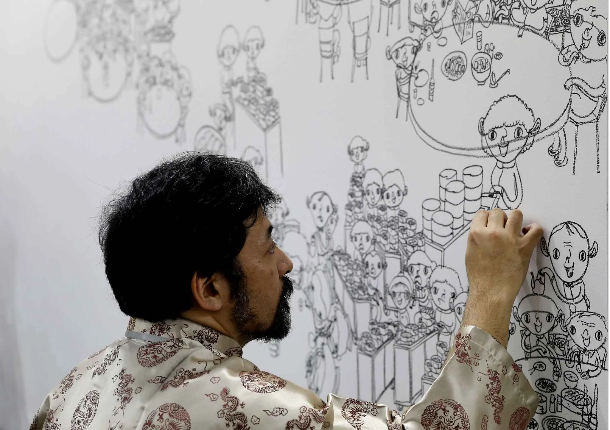 Japanese artist Shintaro Miyake draws an artwork “Excursions in Asia” at his booth during the VIP preview of the art fair Art Basel in Hong Kong Friday, March 13, 2015. (Photo by Kin Cheung/AP Photo)
