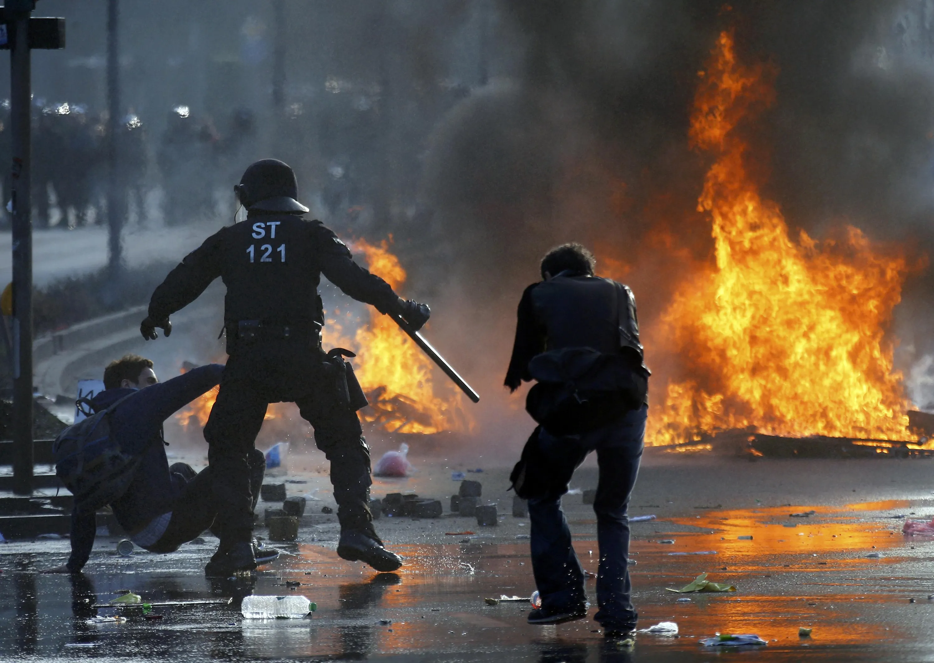 A policeman stops a “Blockupy” anti-capitalist protester near the European Central Bank (ECB) building before the official opening of its new headquarters in Frankfurt March 18, 2015. (Photo by Kai Pfaffenbach/Reuters)