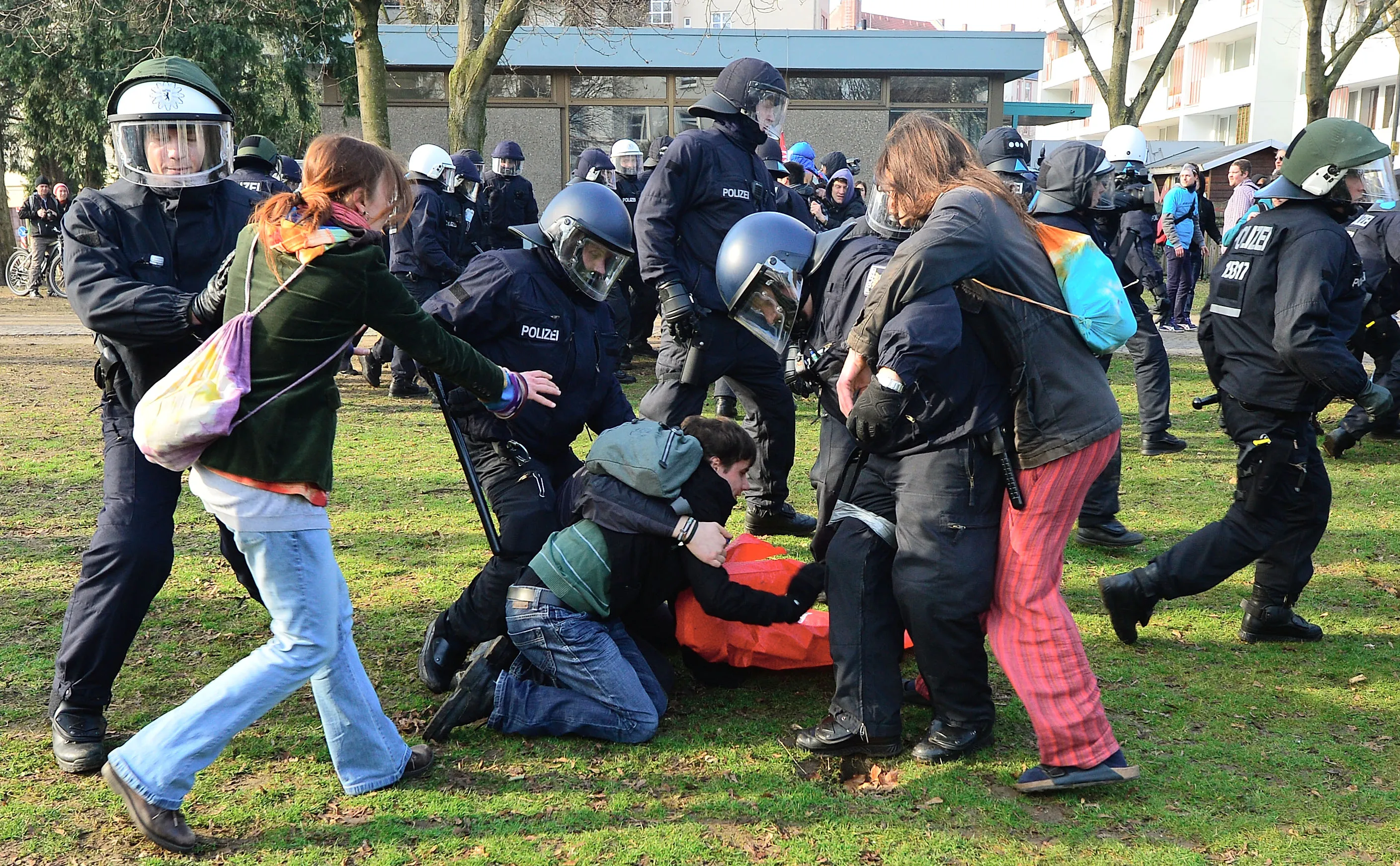 Activists clash with police during a demonstration organized by the Blockupy movement to protest against the policies of the European Central Bank (ECB) after the ECB officially inaugurated its new headquarters earlier in the day on March 18, 2015 in Frankfurt, Germany. (Photo by Thomas Lohnes/Getty Images)