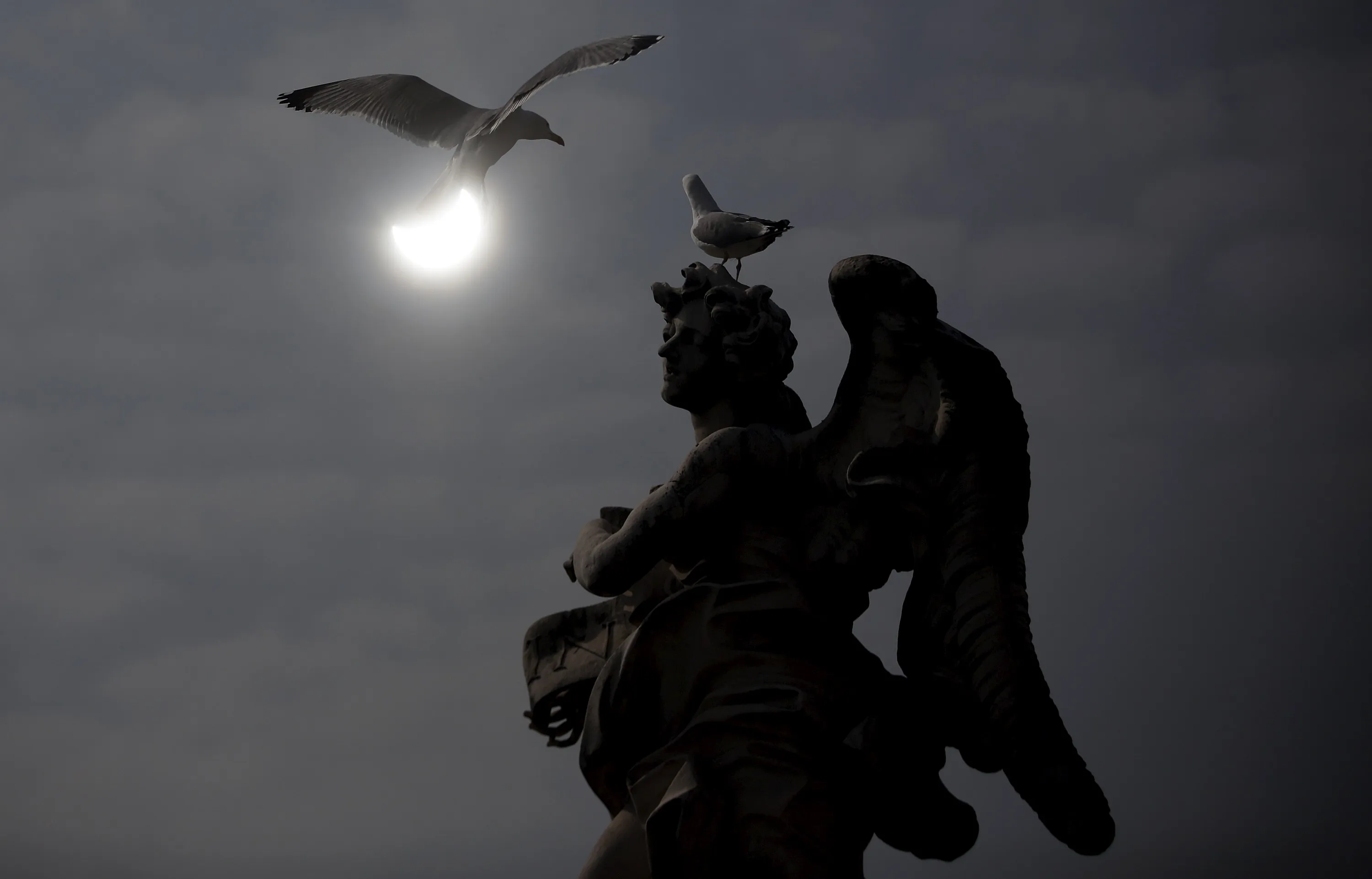 A partial solar eclipse is seen over a statue at the Mausoleum of Hadrian, usually known as Castel Sant'Angelo, in Rome March 20, 2015. (Photo by Yara Nardi/Reuters)