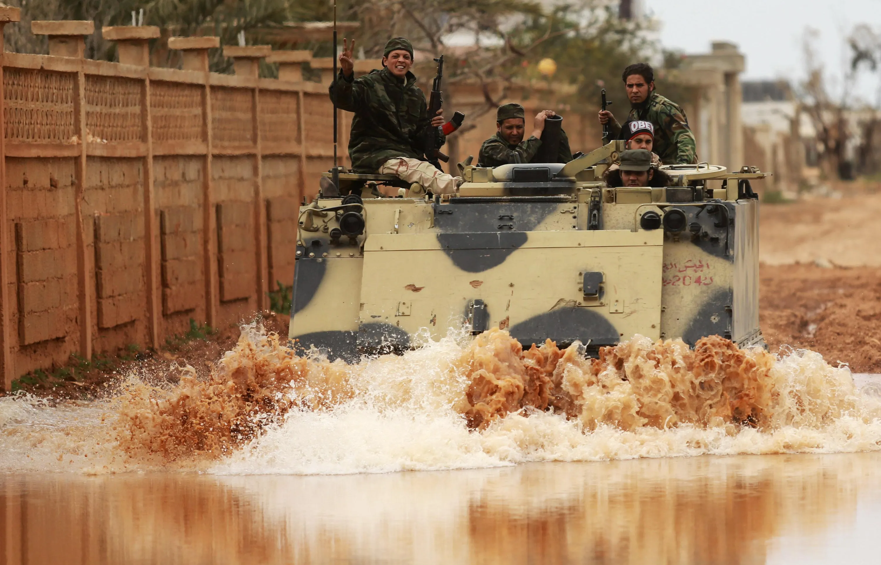 Members of the Libyan pro-government forces, backed by the locals, ride in a military vehicle during clashes in the streets with the Shura Council of Libyan Revolutionaries, an alliance of former anti-Gaddafi rebels who have joined forces with Islamist group Ansar al-Sharia, in Benghazi March 16, 2015. (Photo by Esam Omran Al-Fetori/Reuters)