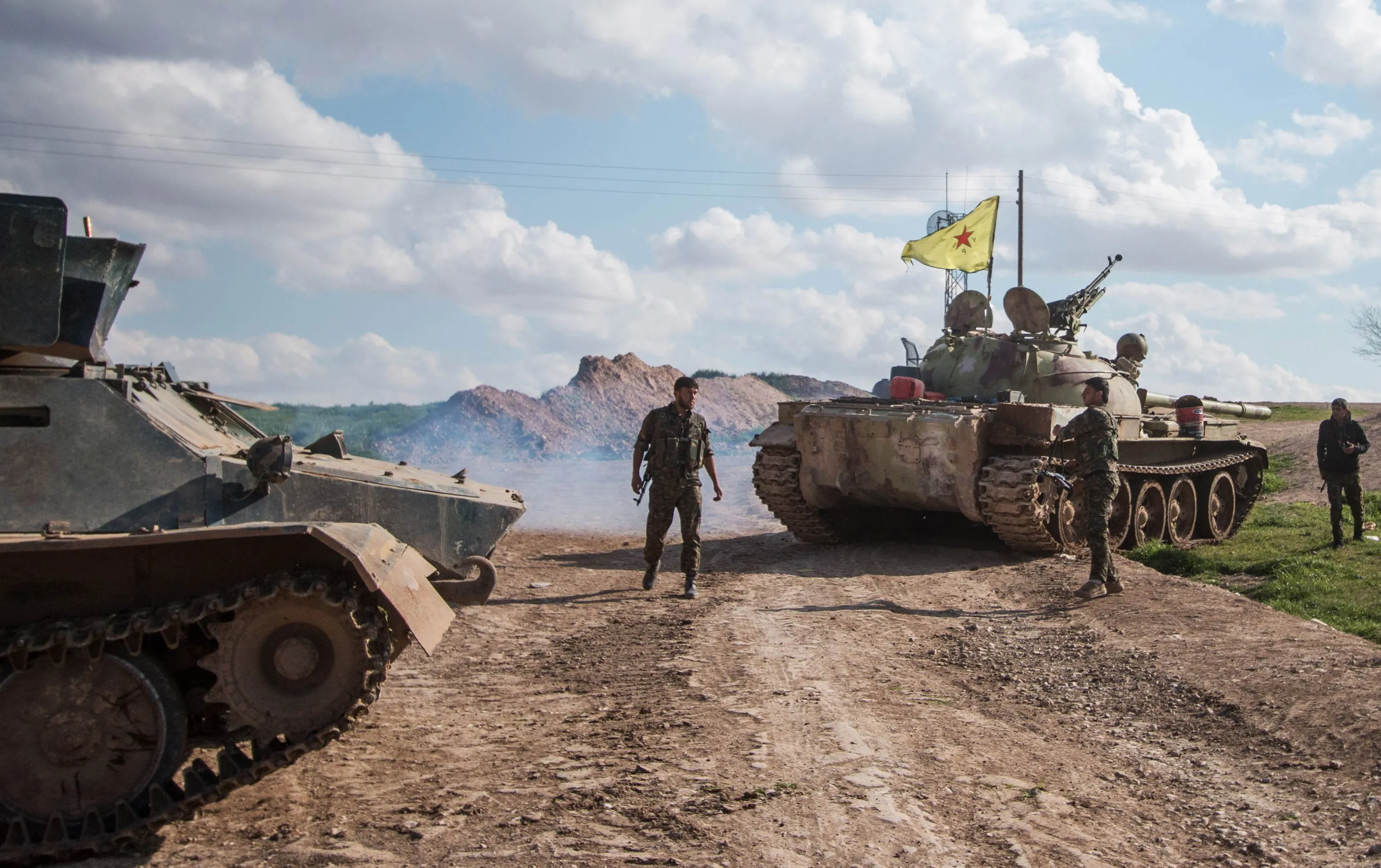 Kurdish People's Protection Units (YPG) fighters stand near a tank and an armoured carrier before heading towards the frontline against Islamic State fighters in the southern countryside of Ras al-Ain March 17, 2015. Picture taken March 17, 2015. (Photo by Rodi Said/Reuters)