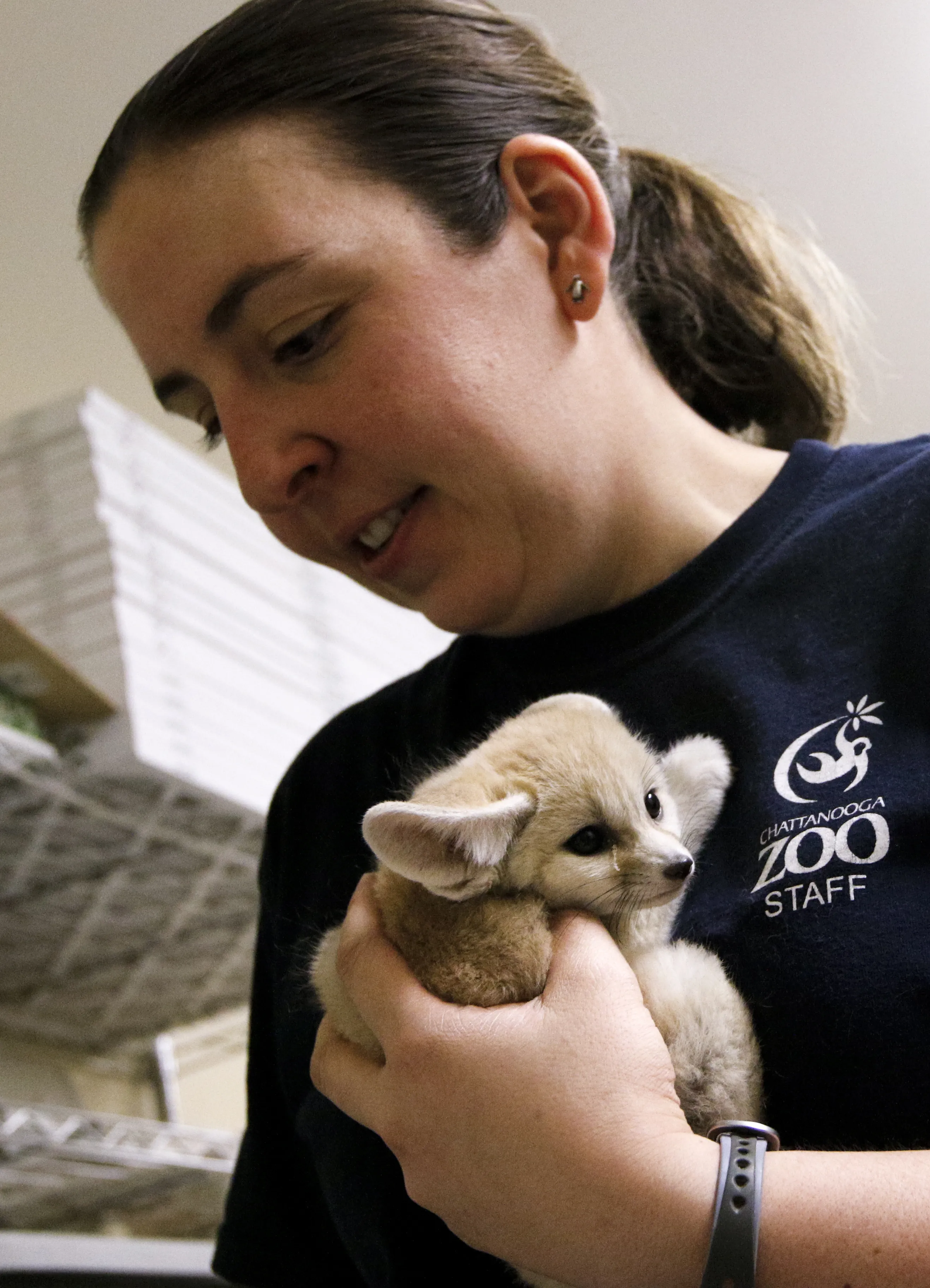 Animal keeper Caiti Robinson weighs a male fennec fox kit Thursday, March 12, 2015, behind the scenes of the desert habitats exhibit at the Chattanooga Zoo in Chattanooga, Tenn. The male is one of two 6-week-old kits born to a single fennec fox mother at the zoo in January. Though they were weighing the kits every other day, now that they are older the zoo has transitioned to weighing them once a week. (Photo by Doug Strickland/AP Photo/Chattanooga Times Free Press)