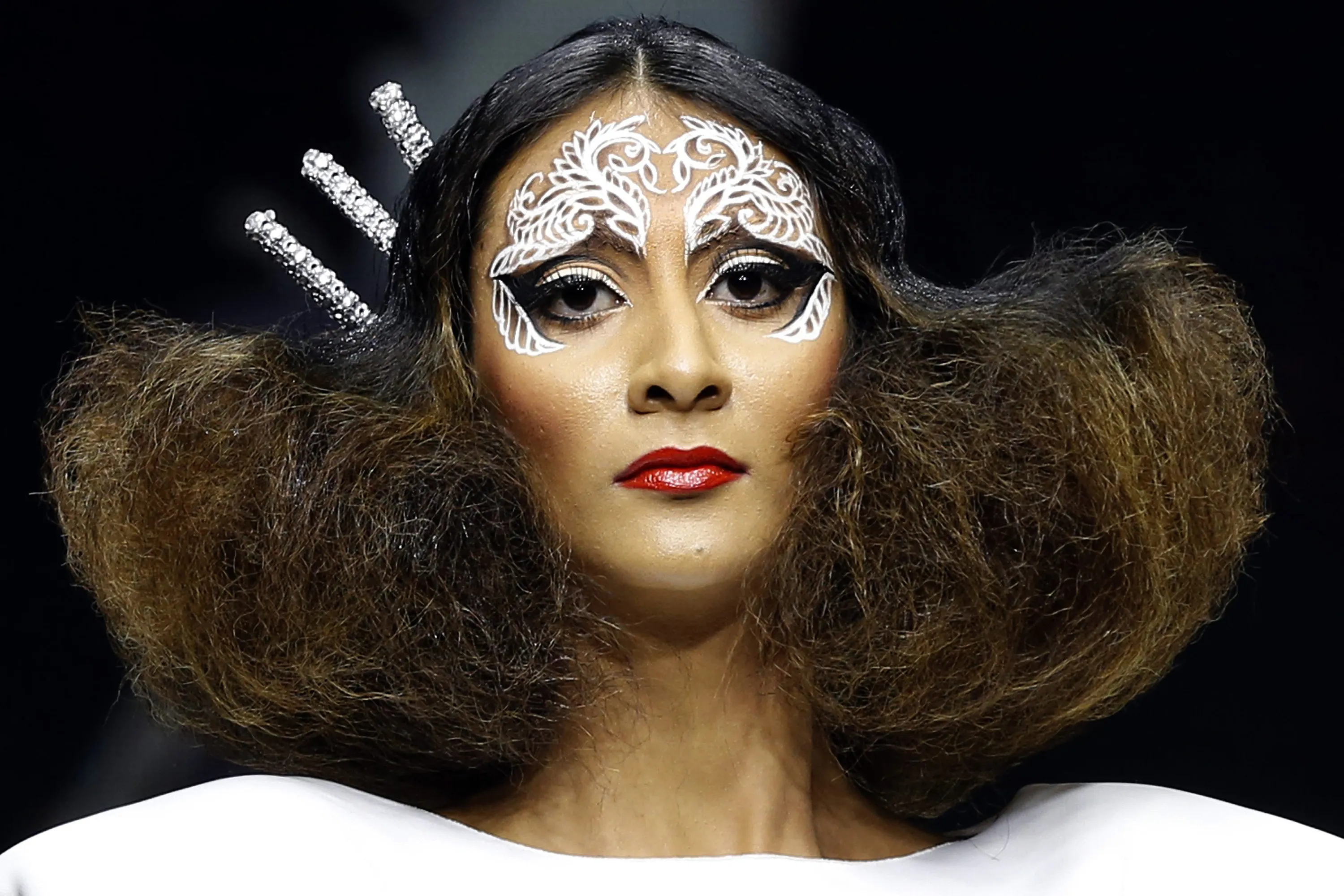 A model presents a creation by Sri Lankan hair designer Ramani Fernando during the Colombo Fashion Week show at Hotel Hilton in Colombo, Sri Lanka, 14 March 2015. The Colombo Fashion Week is a popular annual event attracting international designers and buyers. (Photo by M. A. Pushpa Kumara/EPA)