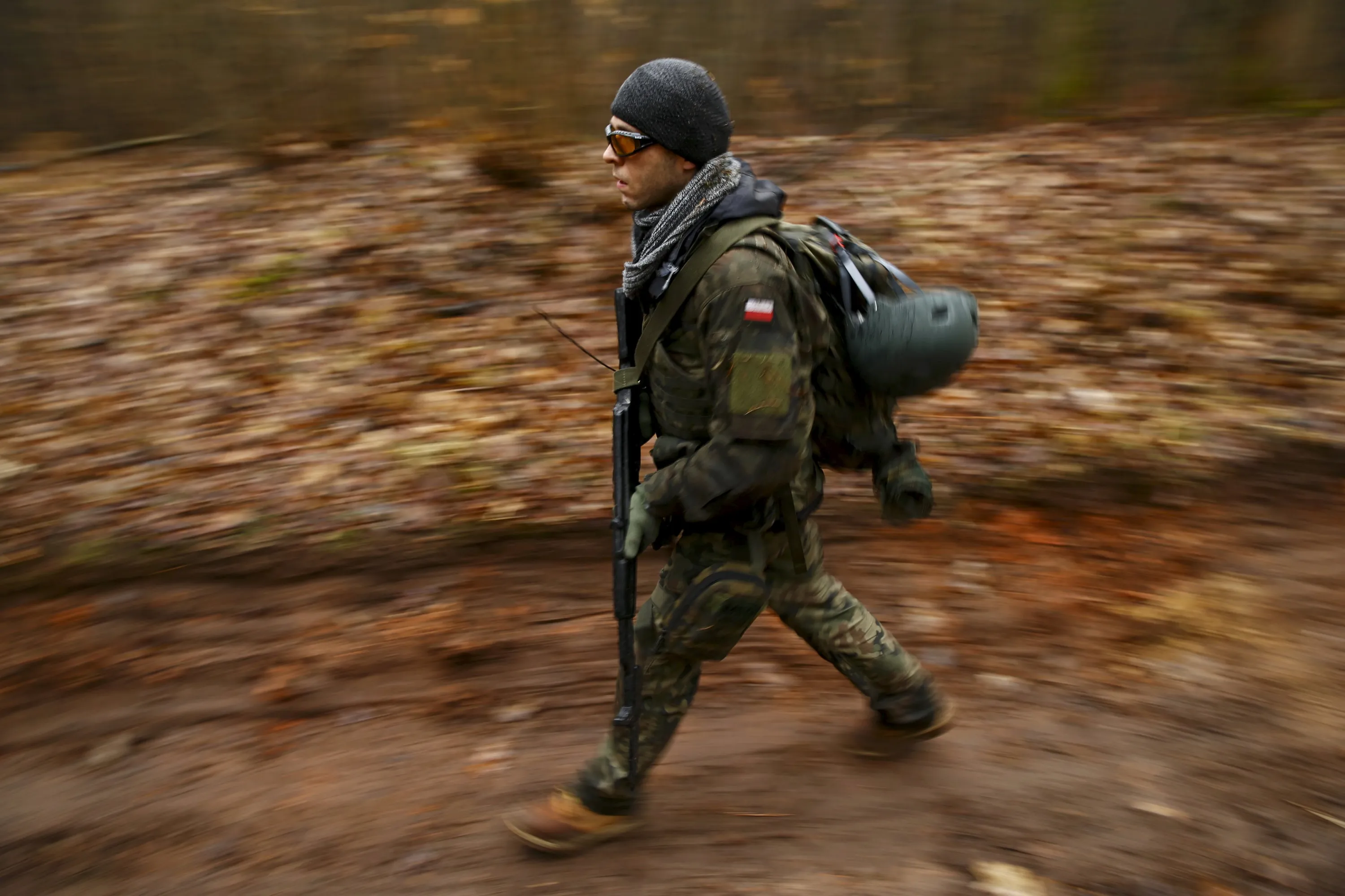A man takes part in an endurance march during a territorial defence training organised by paramilitary group SJS Strzelec (Shooters Association) in the forest near Minsk Mazowiecki, eastern Poland March 14, 2014. (Photo by Kacper Pempel/Reuters)