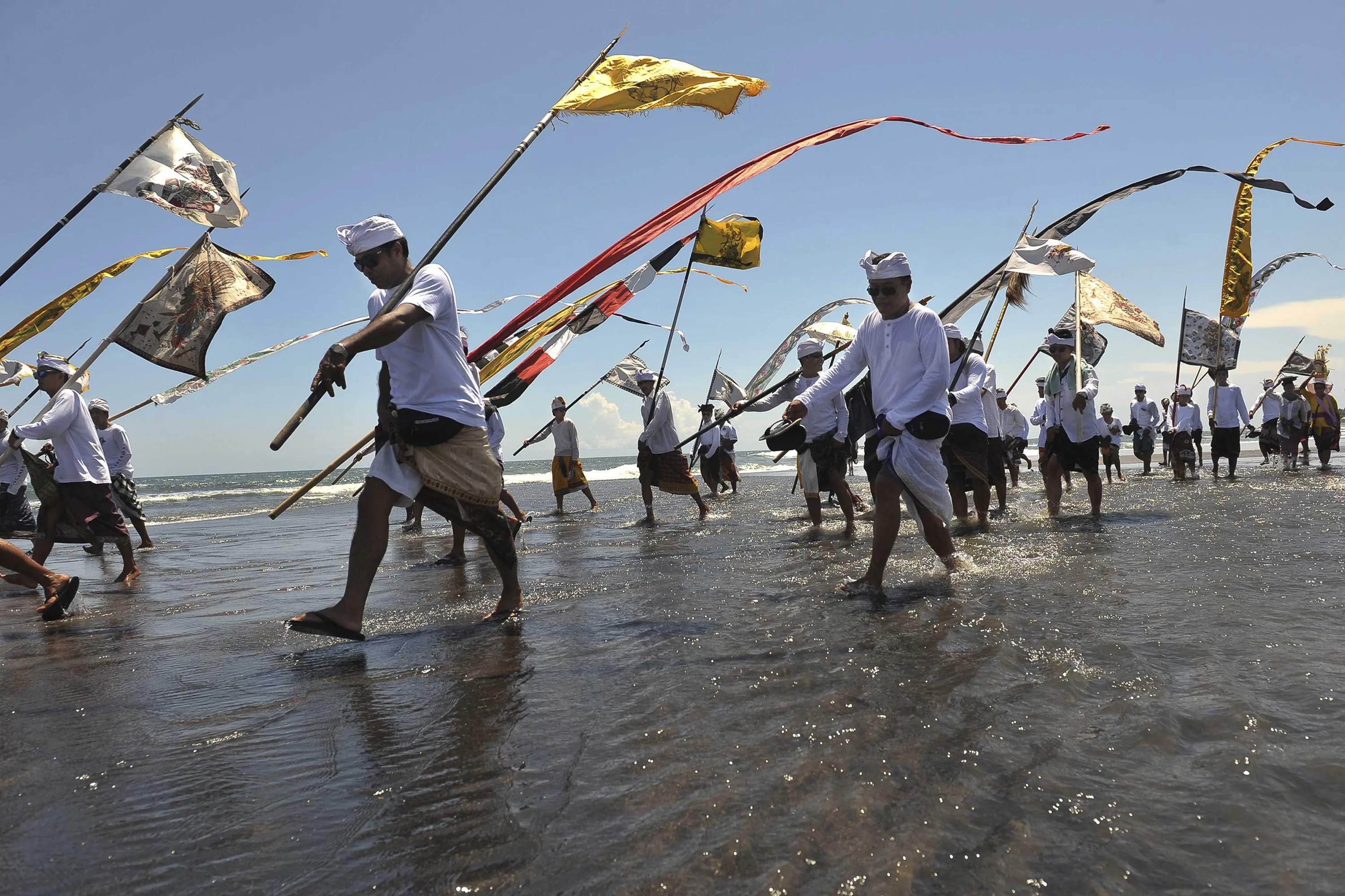 Balinese Hindus walk along the shore during the Melasti ceremony ahead of Nyepi day at Pererenan Beach on the Indonesian island of Bali March 18, 2015 in this photo taken by Antara Foto. Nyepi is a day of silence to celebrate the Balinese new year, reserved for self-reflection, where people are not allowed to use lights, light fires, work, travel nor enjoy entertainment. (Photo by Nyoman Budhiana/Reuters/Antara Foto)