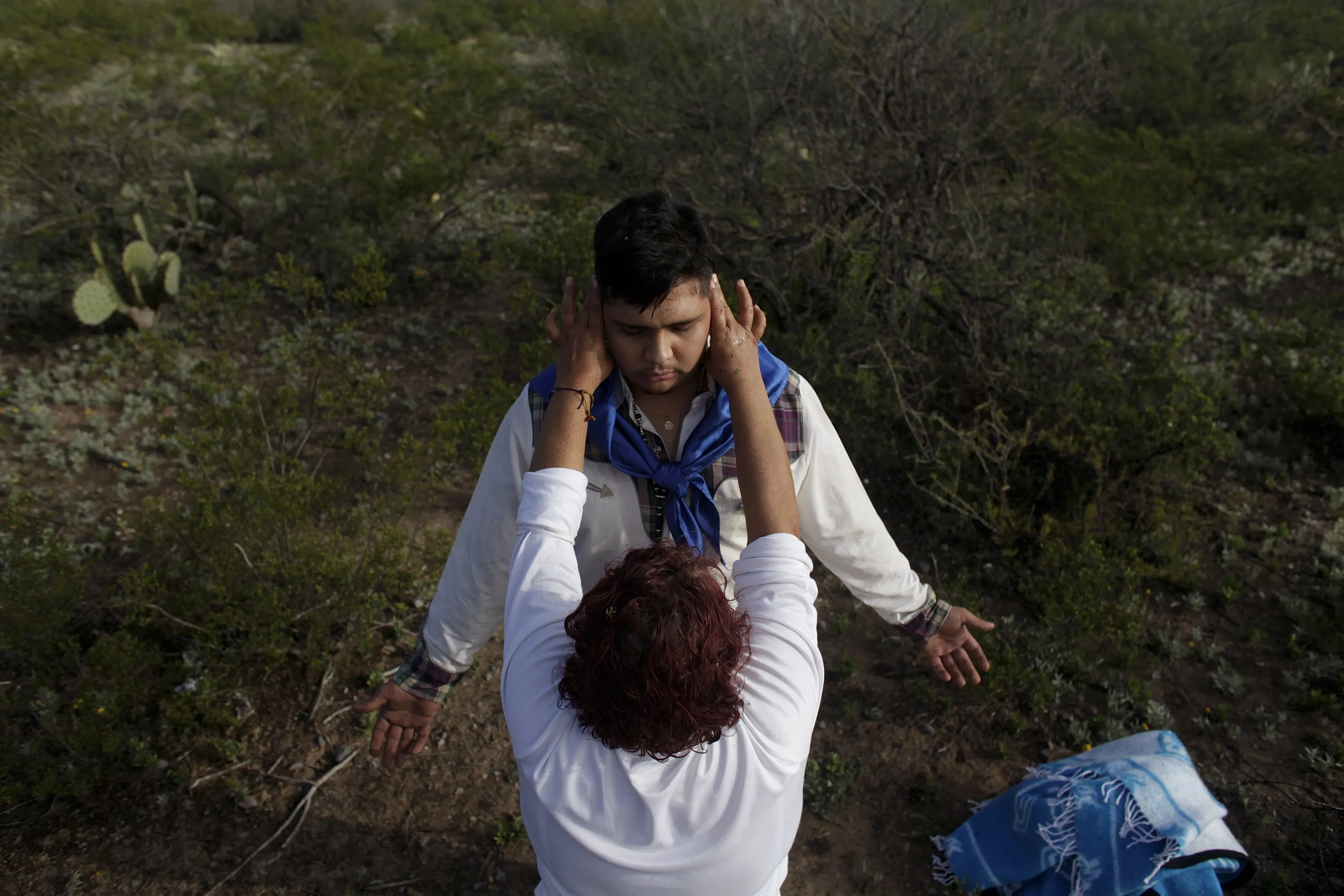 A medium or materia (front) touches the head of a penitent during celebrations for El Nino Fidencio in the town of Espinazo, on the outskirts of Monterrey March 19, 2015. (Photo by Daniel Becerril/Reuters)
