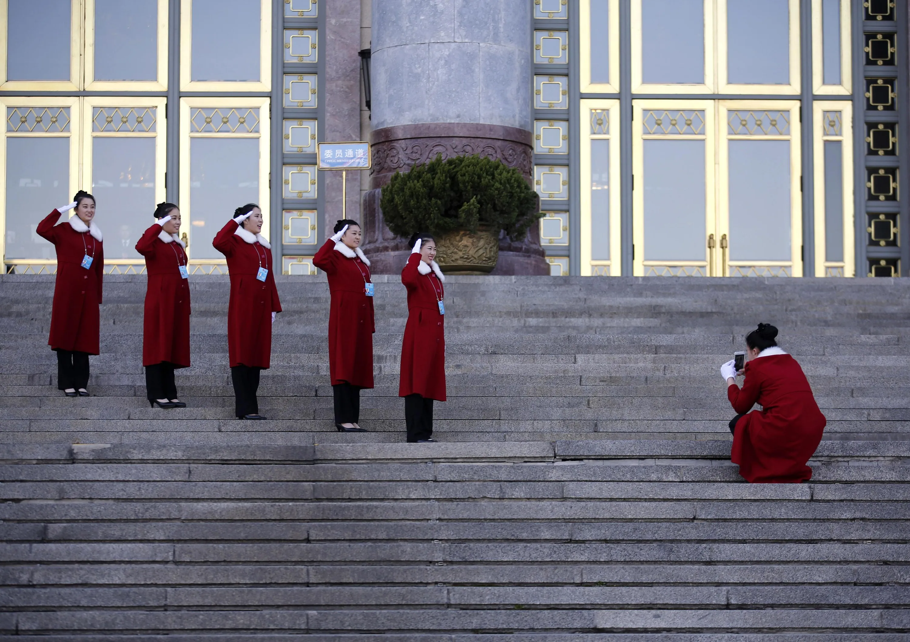 Hotel guides pose for photographs in front of the Great Hall of the People during the third plenary meeting of Chinese People's Political Consultative Conference (CPPCC) in Beijing, March 11, 2015. (Photo by Kim Kyung-Hoon/Reuters)