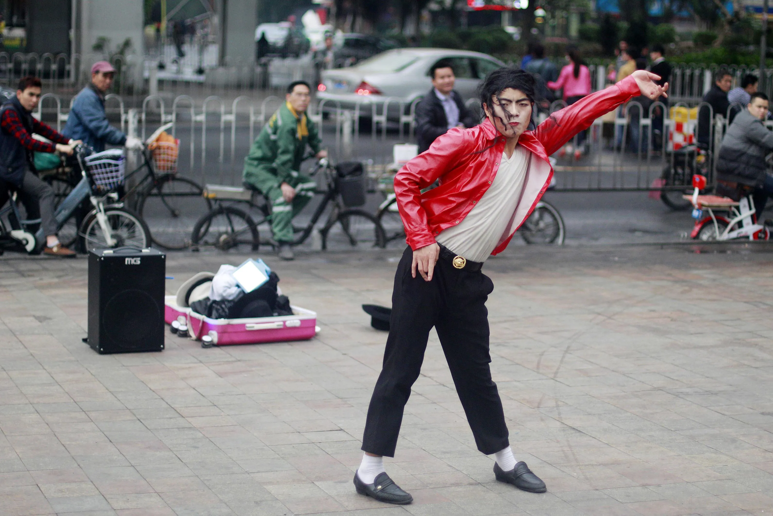 Pedestrians look on as an impersonator of late pop singer Michael Jackson dances near a street in Guangzhou, Guangdong province, March 18, 2015. (Photo by Alex Lee/Reuters)