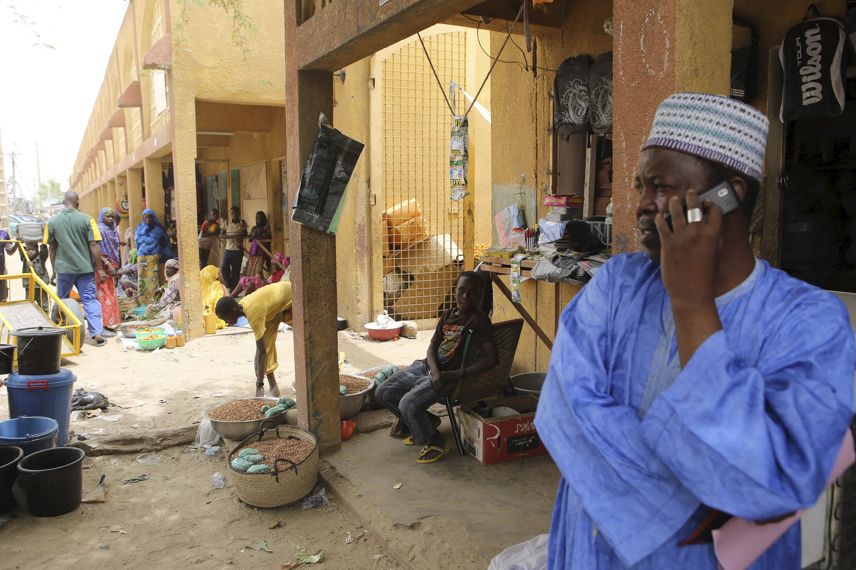 A city official (R) makes a phone call at the main market in Diffa, March 23, 2015. (Photo by Joe Penney/Reuters)
