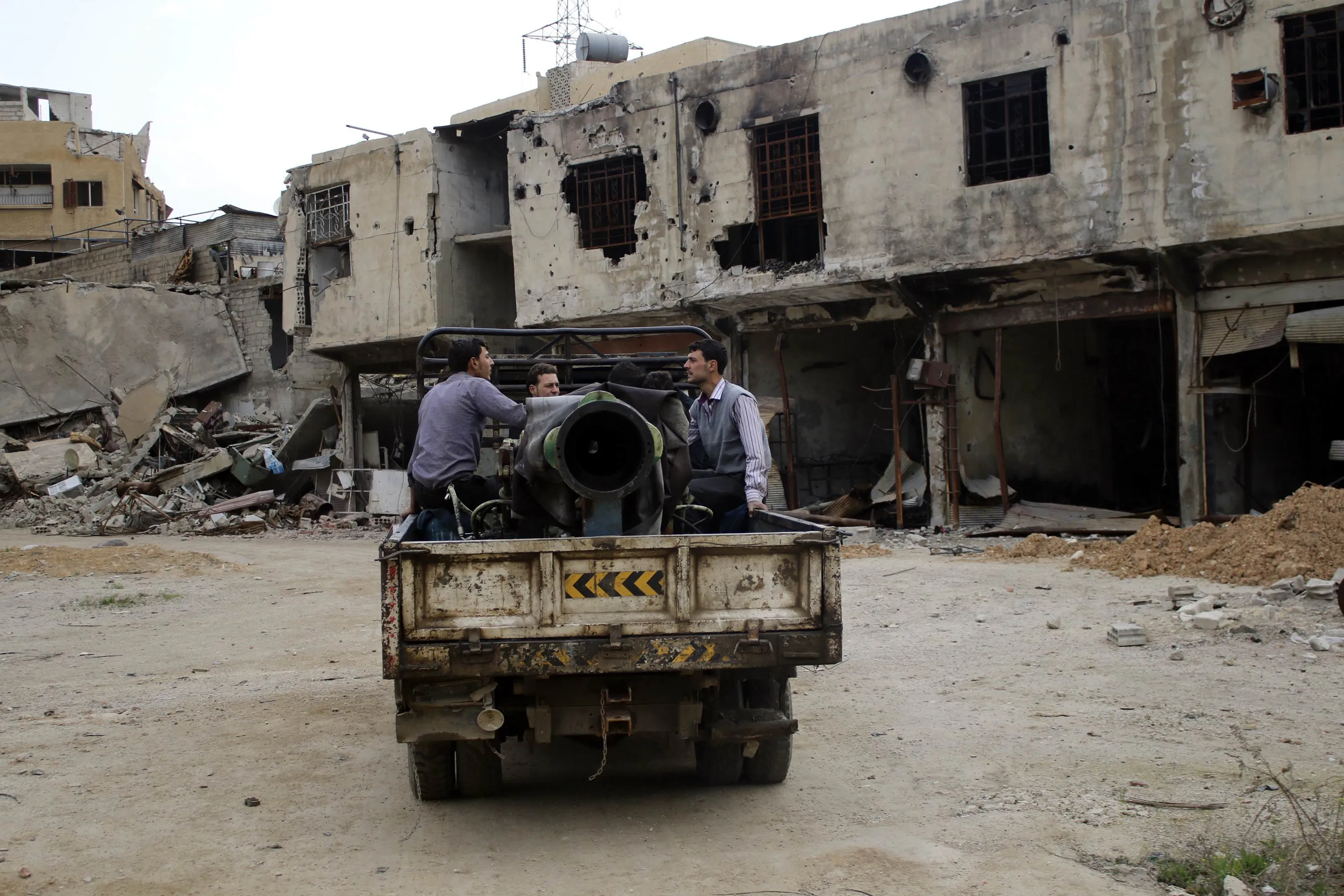 Rebel fighters from the Free Syrian Army's Al Rahman legion prepare a locally made weapon before firing towards forces loyal to Syria's President Bashar al-Assad on the frontline, in the eastern Damascus suburb of Ghouta March 12, 2015. (Photo by Diaa Al-Din/Reuters)