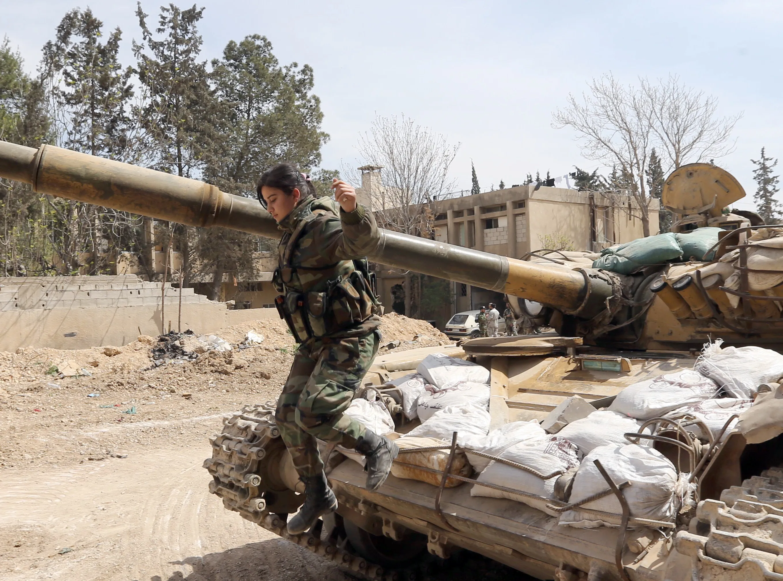 A female Syrian soldier from the Republican Guard commando battalion jumps off a tank during clashes with rebels in the restive Jobar area, in eastern Damascus, on March 25, 2015. (Photo by Joseph Eid/AFP Photo)